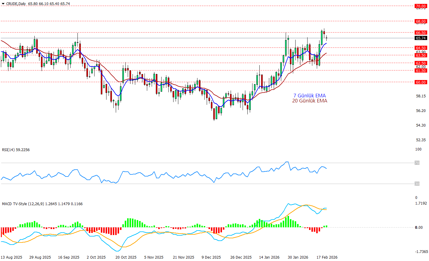 Crude günlük grafikte fiyat 65.70 civarında ve 7 ile 20 günlük EMA’ların üzerinde kalmaya devam ediyor, yani ana resimde yükseliş eğilimi korunuyor. Ancak 66,50 bandı çok net bir direnç alanı haline gelmiş durumda grafikte bu bölgeden gelen satışlar kısa vadede kar realizasyonu sinyali veriyor. Gün içinde tekrar 66.50 test edilmeye başlanabilir ve buranın üzerinde kapanış görürsek sonraki işlem seanslarında 68 v e70 dolar seviyeleri hedef haline gelebilir. Aşağıda ise ilk kritik destek 64,50, sonra 63,50 ve 62,50; özellikle 64,50 altına sarkma olursa yükseliş ivmesi zayıflayıp fiyatın yeniden daha geniş bir düzeltme bandına girdiğini söyleyebiliriz. RSI’ın yaklaşık 59 seviyesinde olması momentumun hala pozitif tarafta kaldığını, MACD’nin sıfır üstünde seyretmesi ise trendin tamamen dönmediğini gösteriyor özetle teknik görünüm pozitif ama 66,50 kırılmadan ivmelenme zor.