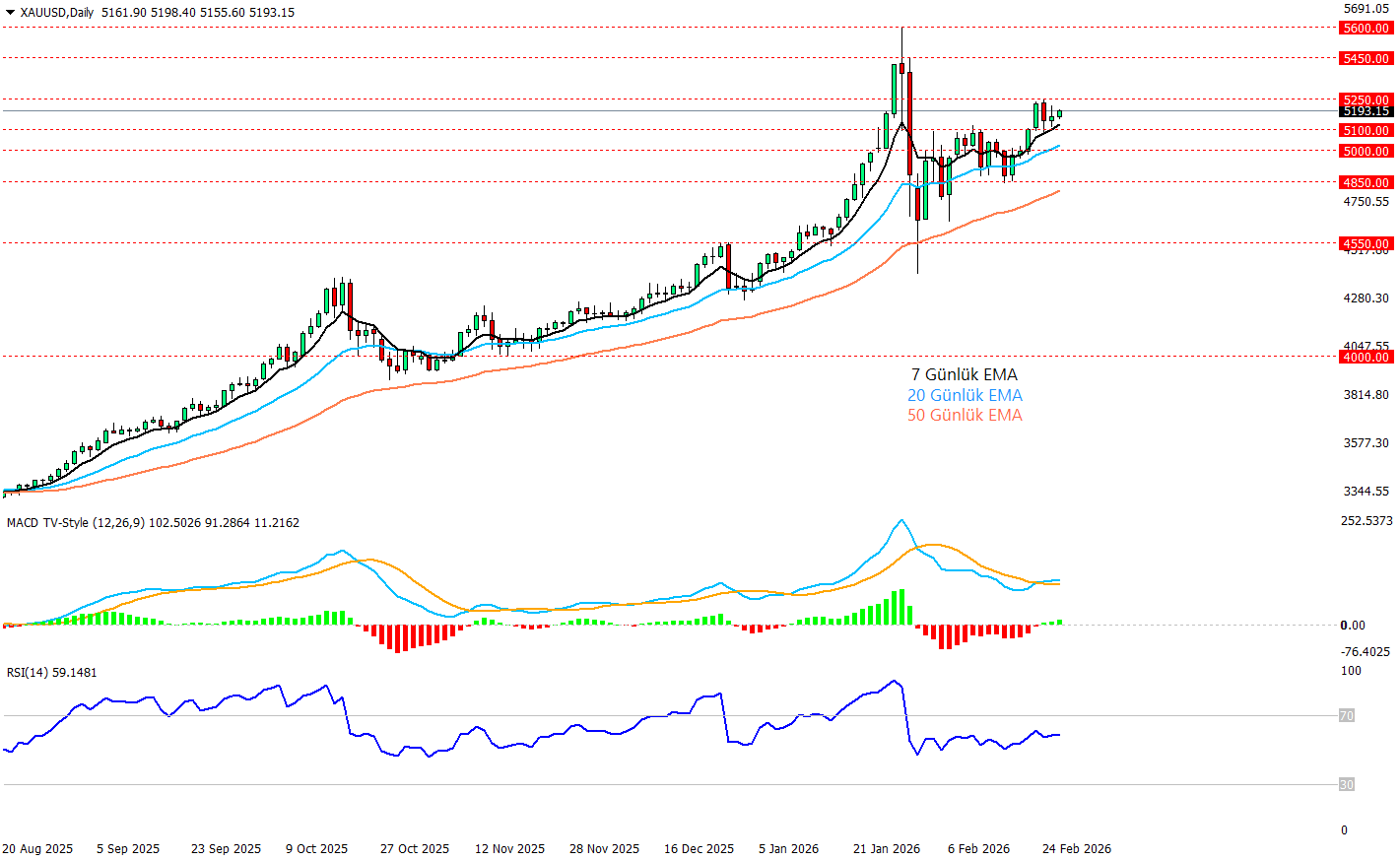 Günlük grafikte 5190 civarlarında seyreden altın gün içinde ABD-İran görüşmelerinin seyrine göre 5250 direncini test edip kırabilir. Önceki günlerde 2 defa test etmiş ama buradan bir satış yemişti, jeopolitik risk desteği artarsa bugün bu seviyenin kırıldığını görebiliriz. Ortalamalara bakarsak alt alta sıralı bir şekilde dizilmeleri pozitif ve 7 günlük EMA’nın fiyatın hemen altında destekleyici bir rol oynaması kısmi düzeltmelerde hızlı destek bulmasını sağlayabilir. MACD göstergesine baktığımızda da pozitife dönen bir histogram yapısı görünmekte ama henüz momentum olarak güçlü değili RSI ise 60 civarlarında bulunarak yukarı yönlü denemelerde alan olduğunu gösteriyor. Gün içinde 5250 seviyesi kritik bir eşik olarak izlenebilir.