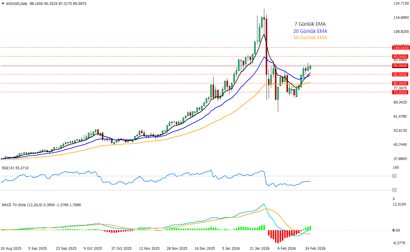 Ons Gümüş günlük grafikte sert rallinin ardından yaşanan düzeltme sonrası yeniden toparlanma denemesi öne çıkıyor fiyat yaklaşık 89,35 civarında ve 7 günlük EMA yukarı eğimle fiyatın altında kalarak kısa vadeli momentumu desteklerken, 20 günlük EMA’nın (mavi) üzerine yerleşme çabası trendin yeniden güç kazanması için kritik görünüyor Momentum tarafında RSI ~55 ile nötr-pozitif bölgede (aşırı alım değil ve MACD’de negatif bölgeden yukarı toparlanma dikkat çekiyor histogramın iyileşmesi düşüş ivmesi zayıflıyor mesajı veriyor. Seviyelerde ise 90 dolar kısa vadeli ilk direnç olarak takip ediliyor buranın üzerinde kalıcılık sağlanırsa 95 ve psikolojik 100 gündeme gelebilir. Olası geri çekilmelerde ise 85 ilk destek olarak izlenebilir.