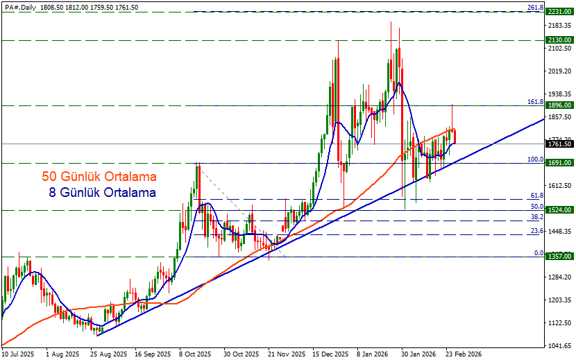 Paladyum geçtiğimiz gün 50 günlük hareketli ortalamayı yukarı yönlü kırarak 1896 direncine kadar yükselişler sonrasında bu dirençten aşağı yönlü tepkiler alarak günlük açılış bölgesine kadar gerileyerek günü 1806 seviyesinde kapattı.