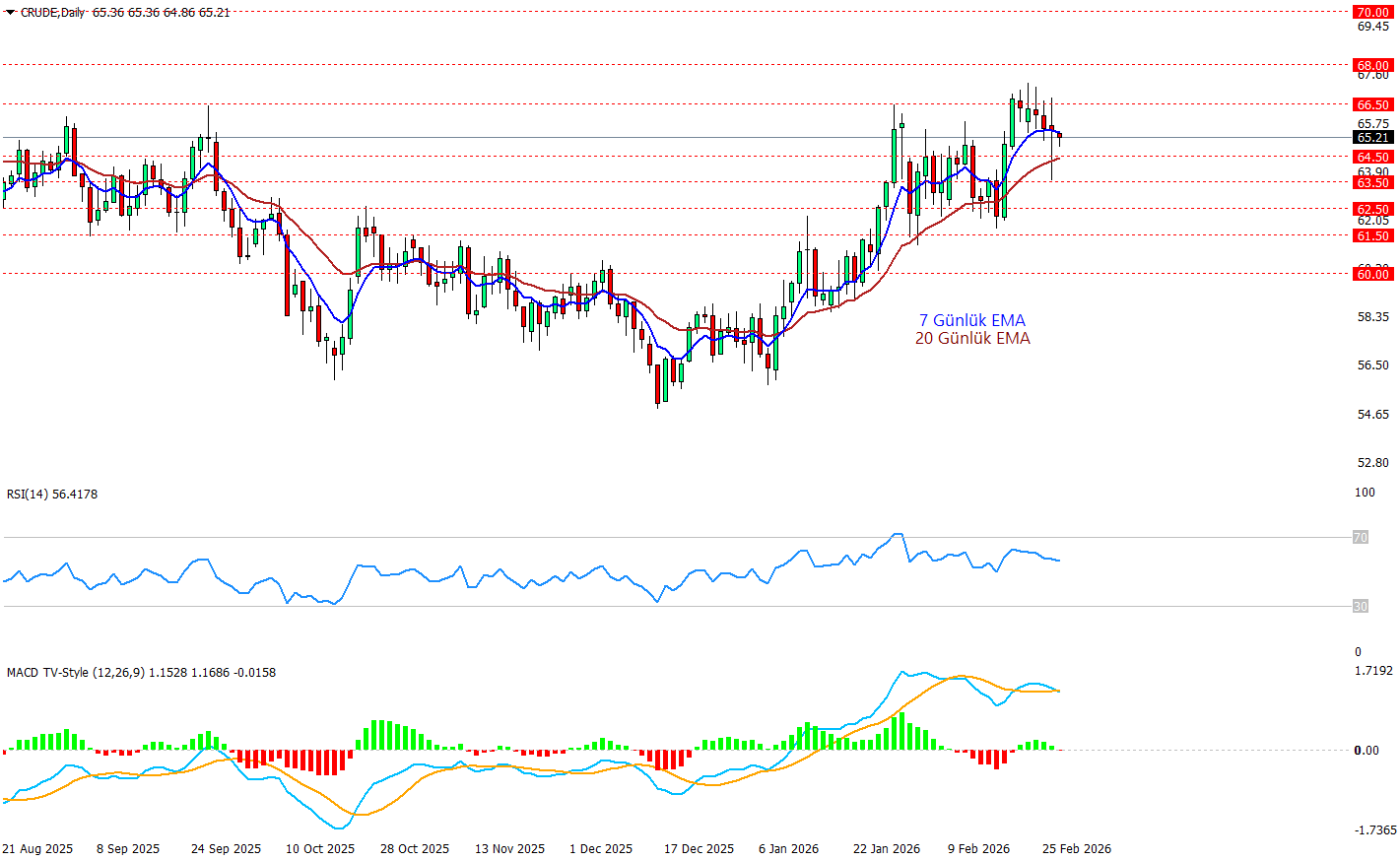 Crude oil günlük grafikte son haftalardaki güçlü yükselişin ardından 66,50–67,00 bandında satışla karşılaşıyor özellikle dün yaklaşık %5’lik geniş bir gün içi volatilite yaşanmasına rağmen fiyatın açılışa yakın kapatması, alıcı-satıcı dengesinin netleşmediği kararsız bir mum yapısına işaret ediyor. Kısa vadede 7 günlük EMA hala 20 günlük EMA’nın üzerinde kalarak trend avantajını korusa da eğimin yavaşlaması momentumun zayıfladığını söylüyor bunu RSI 56 ile nötr-hafif pozitif bölgede ama aşağı yönlü bir kıvrılma yaşıyor. MACD tarafında da benzer bir hikaye var grafikte sinyal çizgisini aşağı kesmiş durumda buda momentumun önümüzdeki saatlerde negatif olarak eseceği izlenimini yaratıyor. Fiyat 64.50 seviyesinden bir alış tepkisi alamaz ise 63.50’ye kadar gün içinde çekilme yaşanabilir.
