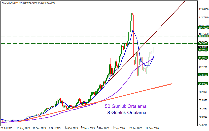 ABD – İran görüşmelerinde olumlu bir sonuç alınamaması ile artan jeopolitik belirsizlikler ons gümüş fiyatlarında yukarı yönlü tepkilere yol açtı. Güne 87.53 seviyesinde giriş yapan ons gümüş 90 direncini aşarak 92.71 seviyesine kadar yükseldi.