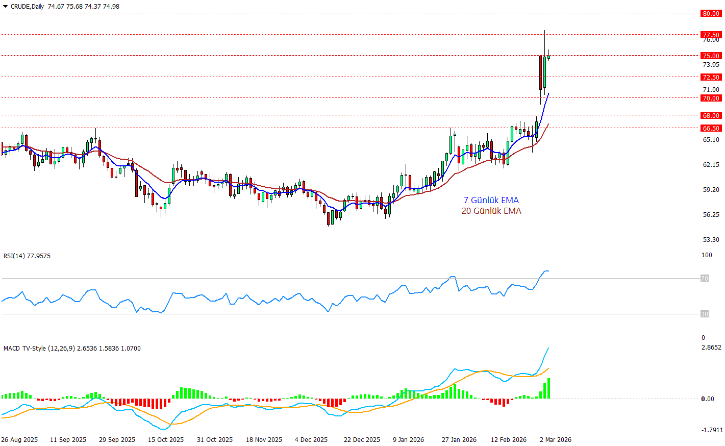 CRUDE günlük grafikte savaş primiyle birlikte ve güçlü bir momentumla dün 77.5 doları geçmişti ama sonrasında bir satış yedi ve şuan 75 dolar seviyesinde bulunup burayı test ediyor. İran’nın Hürmüz boğazını kapatması ve bölgedeki ülkelerin enerji altyapılarına yönelik saldırılarda bulunması kısa vadede enerji maliyetlerini yükseltebilir. Bu durumda Crude petrolün önümüzdeki süreçte 80 doları aştığını görebiliriz. Ortalamalar tarafında da sert bir ivmelenme görülmekte, MACD indikatöründe histogramların ciddi şekilde pozitif yönlü hacimlenmesi ve MACD çizgisinin sinyal çizgisinden sert uzaklaşması yükseliş yönlü hareketler için devamlılık izlenimini oluşturuyor. RSI ise 78 seviyesine kadar çıkmış durumda ve aşırı alım sınırları içerinde bulunuyor ancak savaşın devamlılığı ile bu aşırı alım bölgesinde bir süre daha durabilir.