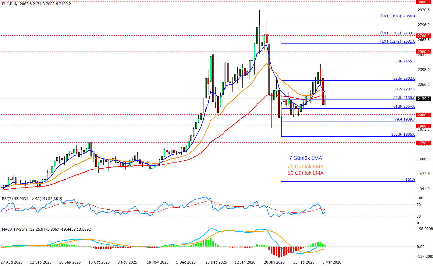 Platin son 2 günde -%13’lük düşüş fiyatı hızlı şekilde aşağı çekerek kısa vadeli görünümü zayıflatmış olsa da, mevcut tabloda fiyatın Fibo 61,8 bölgesinde (yaklaşık 2054 civarı) tutunma çabası belirgin ve buradan tepki alımıyla yeniden yükselişe geçme ihtimali masada. Eğer bugün 38.2fib 2207 seviyesini geri alıp kapanışını buranın üzerinde yapabilirse hafta kapanışına kadar pozitif bir görünüm ile hareket edebilir. Ortalamalar (7-20-50 EMA) aşağı kırılmış olsa da fiyatın bu bölgede taban araması, olası toparlanmada ilk etapta 2130–2207 (50%–38,2) bandının yeniden test edilebileceğini düşündürüyor buranın aşılması halinde 2302 ve devamında 2455 dirençleri gündeme gelir. Aksi senaryoda 61,8’in altında kalıcılık oluşursa satış baskısı yeniden hızlanabilir ve 2000 psikolojik desteği aşağı yönlü kırılabilir.