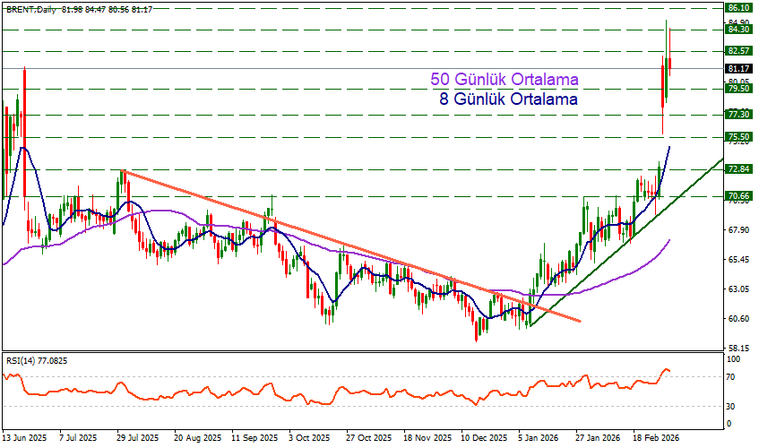 Brent petrol geçtiğimiz gün 85.11 seviyesine kadar yükselişlerin ardından bugün 81.17 bölgesinde işlem görmeye devam ediyor.