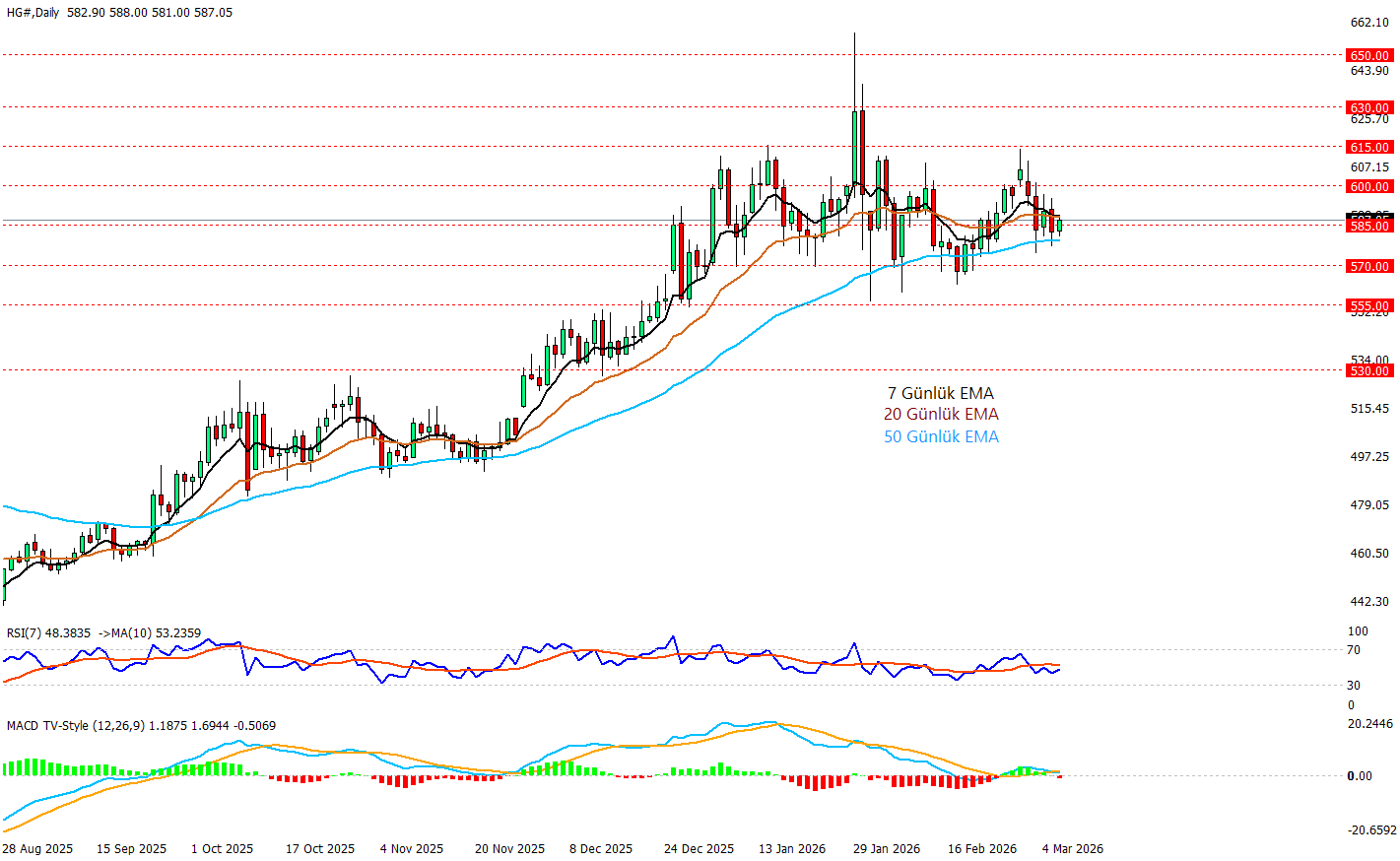 Bakır grafiğine baktığımızda konsolidasyon evresine girilmiş görünüyor fiyat şu anda 585 bandında, kısa vadede 7 ve 20 günlük EMA’ların birbirine yaklaşması ve 7 günlüğün 20’liği aşağı kesme noktasına gelmesi momentumun zayıfladığını RSI’ın 47 civarında kalması ise ne alıcıların ne de satıcıların tam kontrolü alabildiğini gösteriyor, yani grafikte bir miktar nefeslenme var diyebiliriz. Teknik olarak 585 seviyesi ilk eşik ve fiyat şuanda burayı kırmak için çabalıyor, bunun altına sarkarsa 570 ve ardından 555 destekleri gündeme gelebilir yukarıda ise 600, ardından 615 ve 630 seviyeleri direnç olarak izlenmeli. Son gelişmeler tarafında ise bakırda yapısal hikaye hala güçlü ABD’nin tarife politikalarının yarattığı stoklama etkisi, büyük madenlerdeki arz aksaklıkları ve AI-veri merkezi-elektrifikasyon kaynaklı talep beklentileri var. Buna ek olarak Çin’in yeni planında bakır kapasitesinin yönetileceği mesajı verildi. Sene başından beri 570-615 aralığında hareket eden bakırda yeni bir trend başlangıcı için 615 bandının kırılması gerekiyor.