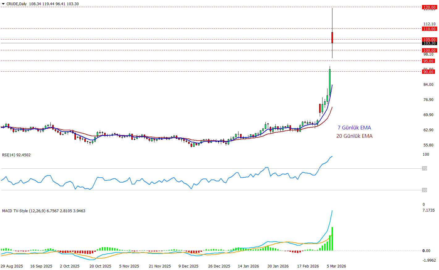 Teknik tarafta da incelediğimizde grafik bu panik alımının bütün izlerini taşıyor fiyat çok kısa sürede 7 ve 20 günlük EMA’lardan sert biçimde uzaklaşmış, RSI 91 seviyesine tırmanarak aşırı alım bölgesinin de ötesine geçmiş ve MACD güçlü momentum üretmiş durumda bu, ana eğilimin yukarı olduğunu söylüyor. Ama mumun yapısı ilginç çünkü119.44’e kadar uzanan sert yükseliş sonrası fiyatın yaklaşık 100 dolar civarına geri çekilmesi, yukarıda çok kuvvetli satış ve kar realizasyonu geldiğini gösteriyor yani piyasa henüz 120 dolar seviyelerini kabul etmiyor. Ama şuan fiyat 100 dolardan destek bulmaya çalışıyor her ne kadar ara ara 99 dolara gerilese de fiyat kendini 100 dolar üstüne atabiliyor o yüzden ara ara 99-98 dolara gerilemesi net bir kırılım olarak okunmamalı.