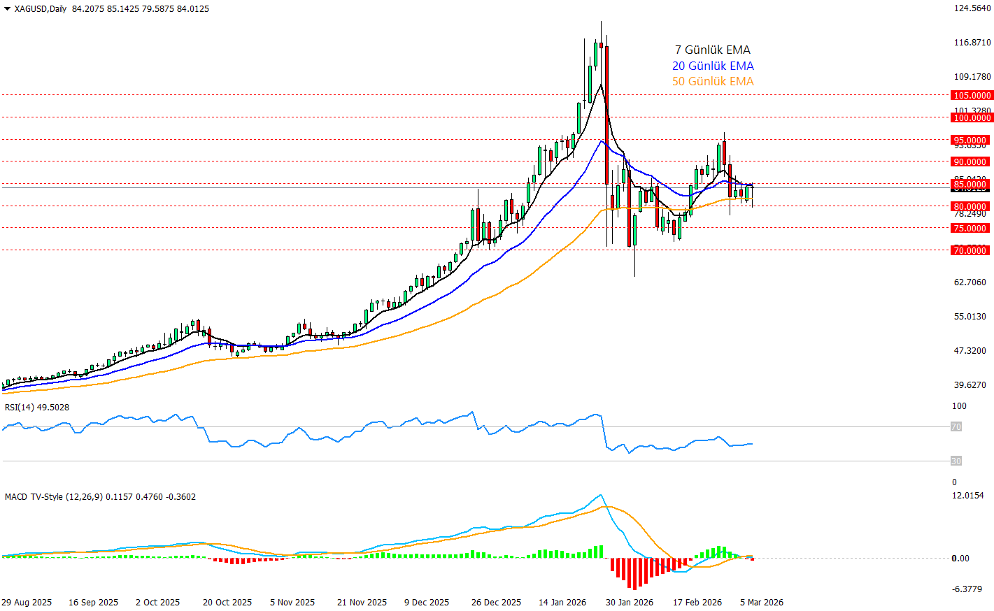 Teknik tarafta grafik de bu kararsız ama kırılgan tabloyu doğruluyor. Şu an 80–85 bandında sıkışan yapı, güçlü bir yön seçme eşiğinde duruyor. Fiyat 7, 20 ve 50 günlük ortalamaların birbirine yaklaştığı bölgede dalgalanırken RSI yaklaşık 49 seviyesinde nötr bir momentuma işaret ediyor, MACD tarafında da ivmenin zayıfladığı görülüyor. Sonuç olarak 85 dolar üzeri kalıcı kapanışlar gelirse önce 90 ardından 95 bandına doğru yeniden toparlanma alanı açılabilir çünkü temel tarafta yapısal açık hikayesi tamamen ölmedi. Buna karşılık 80 desteği aşağı kırılırsa satış baskısı 75 ve ardından 70 bölgesine doğru derinleşebilir bu senaryoda güçlü dolar, yüksek faiz ve zayıflayan büyüme korkusu teknik kırılmayı besler. Kısacası gümüş şu an yön arayan bir eşikte temel görünüm orta vadede tamamen kötü değil, ama kısa vadede fiyat dolar ve risk iştahı ekseninde hareket ediyor.