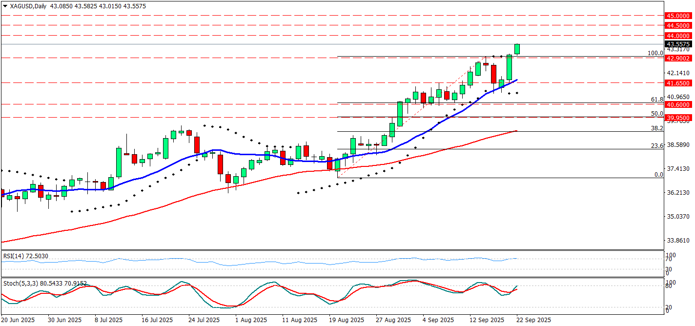 Grafikte XAGUSD (gümüş) günlük periyotta güçlü yükseliş trendini sürdürüyor. Fiyat 43,55 seviyesinde işlem görmekte ve hem 14 günlük ortalama hem de Parabolic SAR göstergesi trendin yukarı yönlü olduğunu teyit ediyor. RSI 72 seviyesinde, aşırı alım bölgesine girmiş durumda; Stokastik ise 80 üzerinde kısa vadede yorulma sinyalleri veriyor.Öte yandan 44,00 ve 44,50 seviyeleri önemli direnç alanları olup, 45,00 seviyesine doğru yükselişin devamı için kritik eşik konumunda. Olası düzeltmelerde 42,00 ve 41,65 destekleri izlenebilir. Genel görünümde trend pozitif, ancak aşırı alım bölgeleri kısa vadeli kar realizasyon riskini artırıyor.