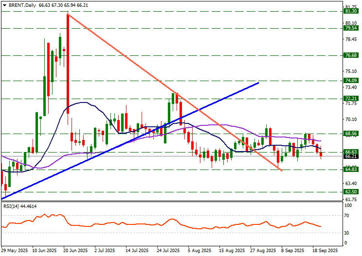 Brent petrol geçtiğimiz hafta 68.56 direncinden başlayan düşüş ivmesine yeni hafta başlangıcında da devam etti. Güne 66.63 seviyesinde giriş yapan brent, önce 67.30 seviyesine kadar yükseliş denemeleri yapsa da kalıcılık sağlayamadı ve düşüş ivmesine kaldığı yerden devam etti. Gün içi düşüşler 65.94 seviyesine kadar etkili oldu. Anlık fiyatlamalar ise 66.21 bölgesinde negatif fiyatlanmayı sürdürüyor. Aşağı yönlü fiyatlamaların devamında 64.83 bölgesi destek oluşturaibilir.