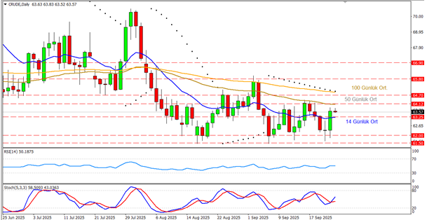 Petrol fiyatları, Trump’ın Rusya’ya yönelik sert söylemleri ve OPEC+ arz endişelerinin desteğiyle son günlerde yukarı yönlü bir ivme yakaladı. Teknik tarafta, fiyatın 63,50 seviyesinde tutunarak 14 günlük ortalamanın üzerine çıkması kısa vadede alıcıların güçlendiğini gösteriyor. RSI’ın 50 seviyesinin üzerinde olması momentumun toparlandığına işaret ederken, Stokastik göstergede yukarı yönlü kesişim yükseliş sinyalini destekliyor. Yukarıda 64.12 seviyesindeki 50 günlük ortalama ilk güçlü direnç olarak öne çıkarken, 64.70 ve 65.80 seviyeleri ise daha üst direnç bölgeleri olarak izlenebilir. Genel görünüm, jeopolitik ve arz kaynaklı gelişmelerin fiyatı yukarı taşıdığı ve teknik olarak da yükseliş ihtimalini güçlendirdiği yönünde.