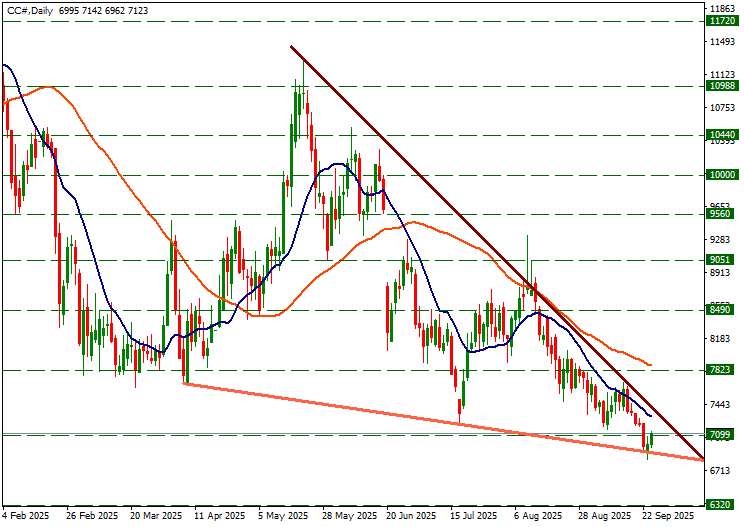 Kakao geçtiğimiz gün alçalan üçgen formasyonu içerisinde alt bandı test etmişti. Hafif sarkma denemeleri kalıcılık sağlayamadı ve gün sonunda pozitif kapanış gerçekleşti. Yeni işlem gününde de pozitif fiyatlamalar etkin kalmaya devam etti. Anlık fiyatlamalar 7099 bölgesini direnç olarak test ediyor. Bu direncin aşılması durumunda alçalan üçgenin üst bandı direnç oluşturabilir. Formasyon görünümü sona doğru yaklaşmışken, formasyondan çıkılacak yön ile oynaklıklar yaşanabilir.