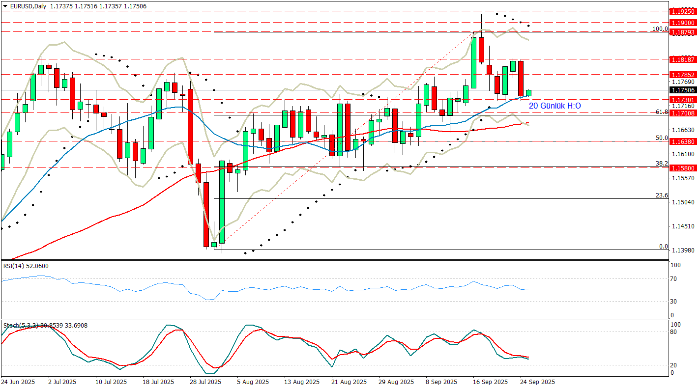 EUR/USD günlük grafikte parite, 1,1818 seviyesinden gördüğü satış baskısıyla geri çekilerek 1,1730 civarındaki 20 günlük ortalamanın üzerinde tutunmaya çalışıyor. RSI 52 seviyesinde nötr bölgede hareket ederken, Stokastik göstergesi aşırı satıma yaklaşarak dipten toparlanma sinyali arayışında. Teknik olarak 1,1730 bandı destek bölgesi olarak öne çıkarken, bu seviyenin altına sarkılması halinde 1,1700 ve 1,1638’e kadar geri çekilme riski oluşabilir. Yukarıda ise toparlanma hareketinde ilk direnç 1,1818, bu seviyenin aşılması durumunda 1,1879 ve 1,1900 dirençleri yeniden gündeme gelebilir. Genel görünümde parite, destek hattında tutunma çabasıyla birlikte karar aşamasında bulunuyor.