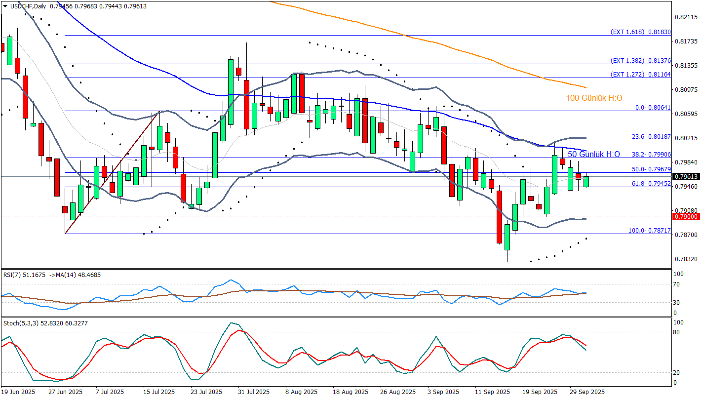 Grafikte görüldüğü üzere USD/CHF paritesi 0,7960 seviyelerinde yatay hareket ediyor. Fiyat, 50 günlük hareketli ortalama (0,7990) ve 61,8% Fibonacci desteği (0,7945) arasında sıkışmış durumda. Bu bant, kısa vadeli yönün belirlenmesi açısından kritik görünüyor. RSI göstergesi 50 seviyesinde nötr sinyal verirken, Stokastik osilatör 60 seviyelerinde ve hafif aşağı eğimli, bu da momentumu zayıflamış bir görünüme işaret ediyor. Parabolic SAR noktaları fiyatın altında, sınırlı da olsa yükseliş eğilimini destekliyor. Yukarı yönde 0,8018 (23,6% Fib.) ve 0,8060 dirençleri önemini korurken, aşağıda 0,7945 ve 0,7870 seviyeleri kritik destekler olarak öne çıkıyor. Genel görünümde, paritenin kısa vadede dar bir bantta konsolidasyonuna devam etmesi beklenebilir; ancak 0,7945 altına kalıcı kırılım satış baskısını artırabilirken, 50 günlük ortalama üzerine testler başlarsa yukarı yönlü hareket hızlanabilir.