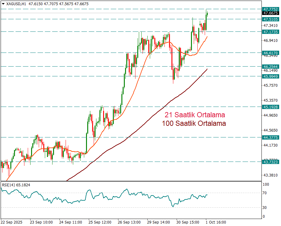 Ons Gümüş gün içinde rekor tazeledi. 21 saatlik ortalama kısa vadede fiyat hareketlerinin hangi yönde ağırlık göstereceğini takip etmek adına yol gösterici olmayı sürdürüyor. Dün 21 saatlik ortalama kırıldıktan sonra 46 $’a kadar gerileyen fiyatlar, akabinde tekrar üstüne çıktığında bugün rekor tazeledi ve 47.77 görüldü.