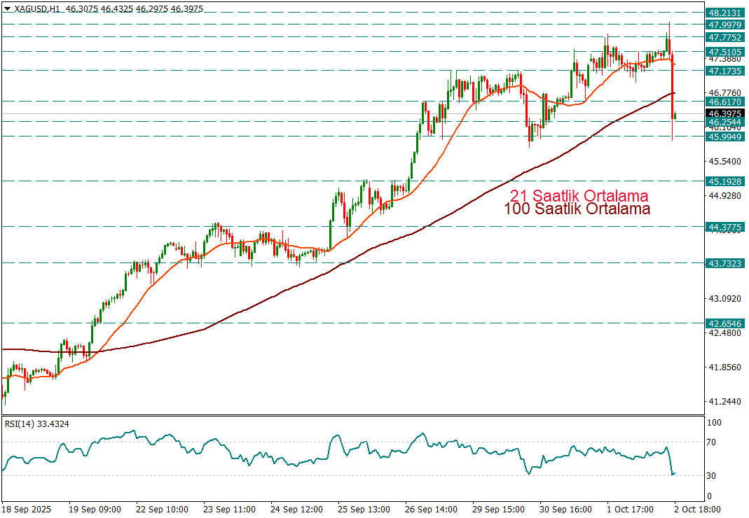 Ons Gümüş 47.51 seviyesinden hızla gerileyerek 46 $’a geriledi. Bu gerileme ile birlikte 21 ve 100 saatlik ortalamaları kırmış oldu. 46 $ seviyesinde düşüş durdu hafif tepki alsa da 100 saatlik ortalamanın altında kalıyor. Kısa vadede 46 $ ile 46.75 $ aralığını takip edeceğiz. Eğer 46.75 $’ın üzerine tekrar çıkabilirse tekrar yükselebilir. 46 – 46.75 arası nötr ve 46 $’ın atında satış baskısı güçlenerek artabilir.