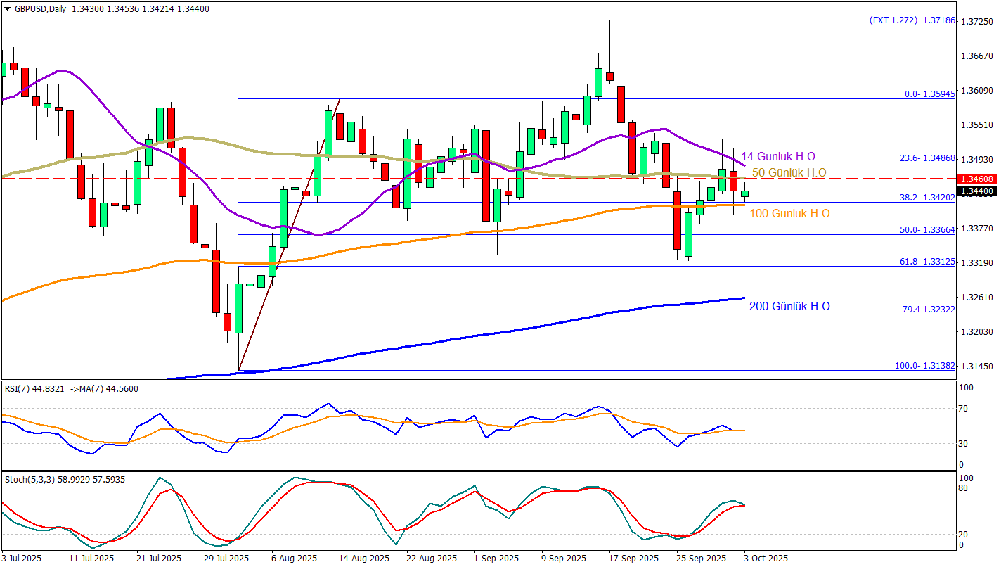 Teknik görünümde Sterlin/dolar paritesi 1,3440 seviyelerinde işlem görürken, fiyatın hem 50 günlük hareketli ortalama hem de 100 günlük ortalama yakınında dengelenmeye çalıştığı görülüyor. Kısa vadede 50 günlük ortalamayı kırıp kıramadığı paritenin yönünde belirleyici olabilir. Fibonacci seviyelerine bakıldığında, parite 1,3420 (38,2%) desteğinin hemen üzerinde tutunuyor. Bu seviyenin korunması halinde 1,3485 (23,6%) ve 1,3590 (0,0) dirençleri ilk hedefler olarak öne çıkıyor.