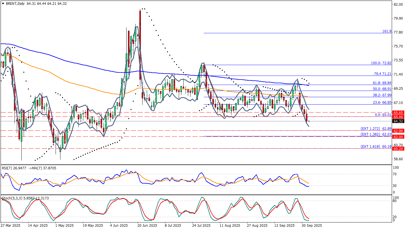 Teknik görünümde ise; Brent petrol fiyatı, son günlerdeki sert satışların ardından 64,30 seviyelerinde işlem görüyor. Grafikte görüldüğü üzere fiyat, 65,00 dolar ana desteğinin altına sarkmış vaziyette. Bu bölgenin altında kalıcılık, aşağı yönlü baskıyı artırarak sırasıyla 62,90 – 62,00 ve diğer bir nokta olan 60,20 seviyelerine doğru geri çekilmeleri gündeme getirebilir. Teknik indikatörler de zayıf görünümü teyit ediyor: RSI (26,9) aşırı satım bölgesinin sınırında, Stokastik göstergesi de aşağı yönlü eğilimini sürdürüyor. Ancak grafiğe dikkali bakıldığında Stokastik yön değiştirmeye başlıyor ve bir sonraki mumla burnunu yukarı çevirip ortalamayı aşağıdan yukarı kesmeye başlayabilir. Bu durumda, olası tepki alımlarında ilk direnç 65.00 ardından 65.65 ve 66.85 seviyelerinde bulunuyor.