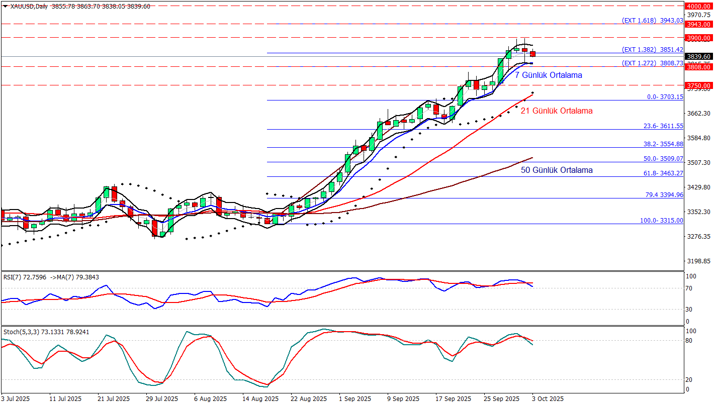 Son ABD verileri, bu yılın ilerleyen dönemlerinde çeyrek puanlık faiz indirimi beklentilerini güçlendirdi ve piyasalar artık Ekim ayında bir indirim olasılığını %98,9, Aralık ayında ise bir indirim olasılığını %88,5 olarak fiyatlıyor. Ancak Dallas Fed Başkanı Lorie Logan'ın faiz oranlarında daha fazla indirime gidilmesi konusunda temkinli olunması yönündeki çağrısının ardından perşembe günü hafif bir baskı altına girdi. Böylelikle Altın üst üste yeni zirvelere ulaştıktan sonra düşüşe geçti. ABD federal hükümetinin kapanmasının ardından artan siyasi belirsizlik ise altın fiyatlarının bu geri çekilişinin kısa sürmesine yol açabilir.