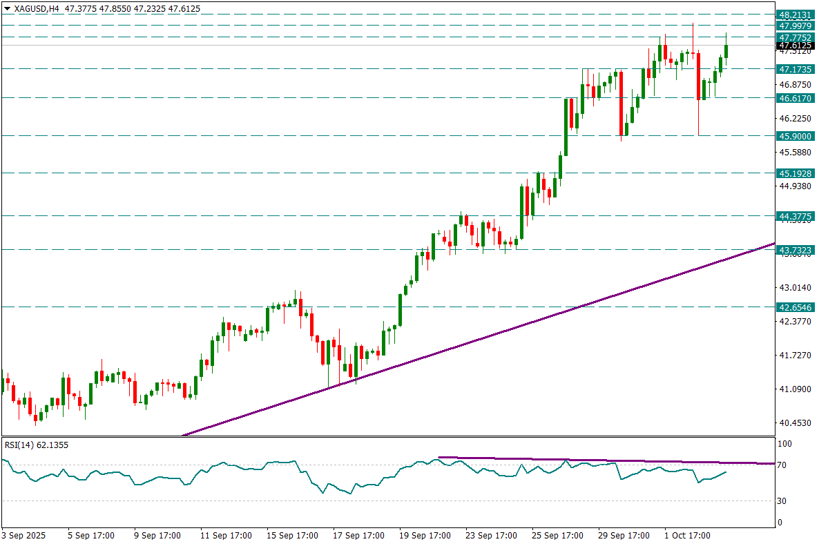 Ons Gümüş günlük bazda aşırı alış bölgesinde tutunmayı sürdürüyor ve burada henüz negatif uyumsuzluk yok. Ancak dört saatlik grafikte dünden bu yana yeni tepe gelmediği için bir zayıflık var. Bir süre eğer yeni tepe gelmezse zayıflık belirginleşebilir. Zayıflık belirginleşmemesi için en azından 47.77’in üzerinde dört saatlik mum kapanışları görmeye ihtiyaç var.