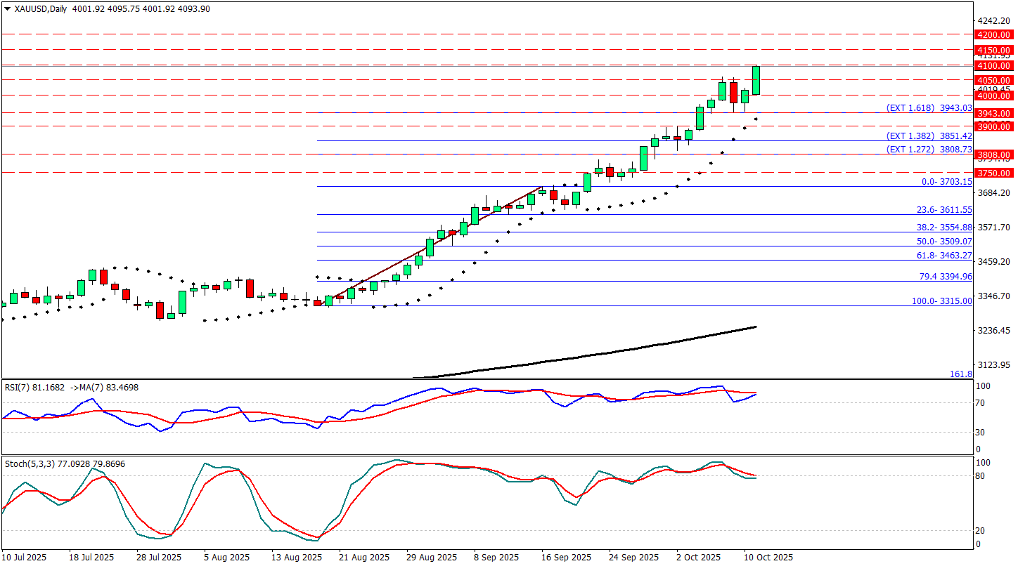 Teknik açıdan bakıldığında, yükseliş trendi güçlü şekilde korunuyor. Fiyat 4000 dolar desteği üzerinde tutunmayı sürdürürken, 4050 direnç seviyesini güçlü geçerek 4100 direncini test etmeye başladı ve yukarıda 4.100 ve 4.150 dolar direnç seviyeleri kısa vadede hedef olarak öne çıkıyor. RSI göstergesi 81 seviyesinde aşırı alım bölgesinde seyrederken, Stokastik osilatör de bu görünümü teyit ediyor. Kısa vadede aşırı alım koşulları nedeniyle sınırlı geri çekilmeler yaşanabilir; ancak 4000 doların üzerinde kalındığı sürece yükseliş eğilimi korunacaktır. Teknik olarak 4.100 doların üzerinde bir günlük kapanış, 4.150 ve 4.200 dolar seviyelerine doğru yeni bir ivmelenmeyi beraberinde getirebilir.