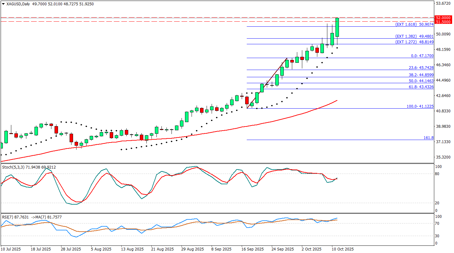 Teknik açıdan bakıldığında, fiyat 51,90 dolar civarında işlem görerek 52,00 dolar direncine oldukça yaklaşmış durumda. Bu seviye, Fibonacci 1.618 uzatma noktası olan 50,90 doların hemen üzerinde yer alıyor ve kısa vadede kritik direnç konumunda. Aşağıda 49,50 ve 48,80 dolar seviyeleri ilk destek bölgeleri olarak takip edilebilir. RSI göstergesi 87 seviyesinde aşırı alım bölgesinde bulunurken, Stokastik osilatör de yukarı yönlü momentumun korunduğunu teyit ediyor. Teknik görünüm genel olarak pozitif; 52,00 doların üzerinde bir kırılma, 53,00 dolar seviyelerine doğru yeni bir yükseliş dalgasını tetikleyebilir. Bugün fiyatın nerede kapatacağı kritik bir nokta olarak takip edilecek.