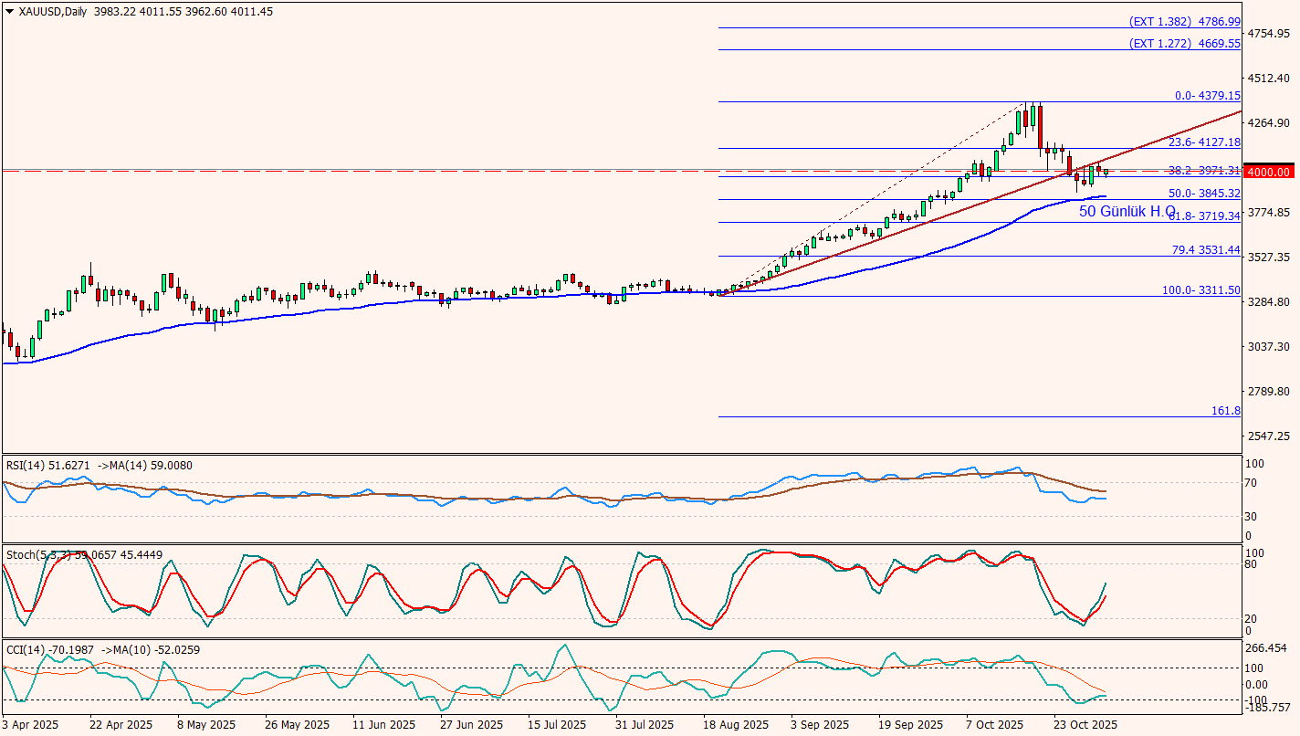 Ons altın şuan 4000 dolar civarında tutunmaya çalışıyor. Göstergeler tarafında ise Stokastik’e baktığımızda pozitif bir görünüm mevcut. CCI ise -100 sınırından yukarı dönmeye başlayarak kısmi bir toparlanma ihtimalini göz önüne getiriyor. Genel olarak göstergeler tarafında ılımlı bir pozitiflik hakimken temel faktörlerdeki risk önümüzdeki günlerde altının yön bulmasında belirleyici olabilir.
