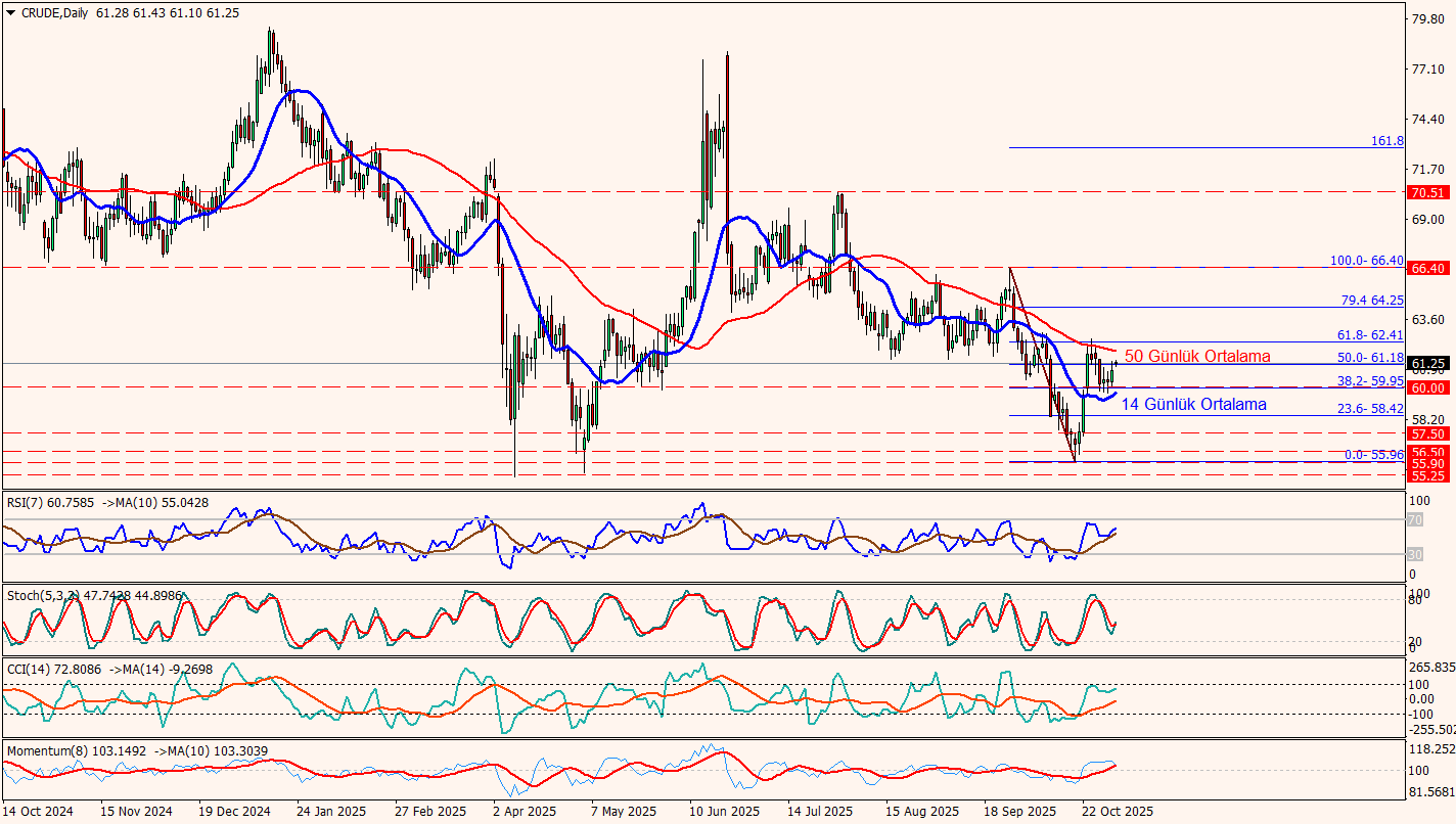 Geçtiğimiz haftayı 50 günlük ve 14 günlük ortalama arasında tamamlayan Crude bu gelişmelerin ardından yeni haftaya 50 günlük ortalama civarına denk gelen 61.18 seviyesinin üzerine taşımış bulunmakta.