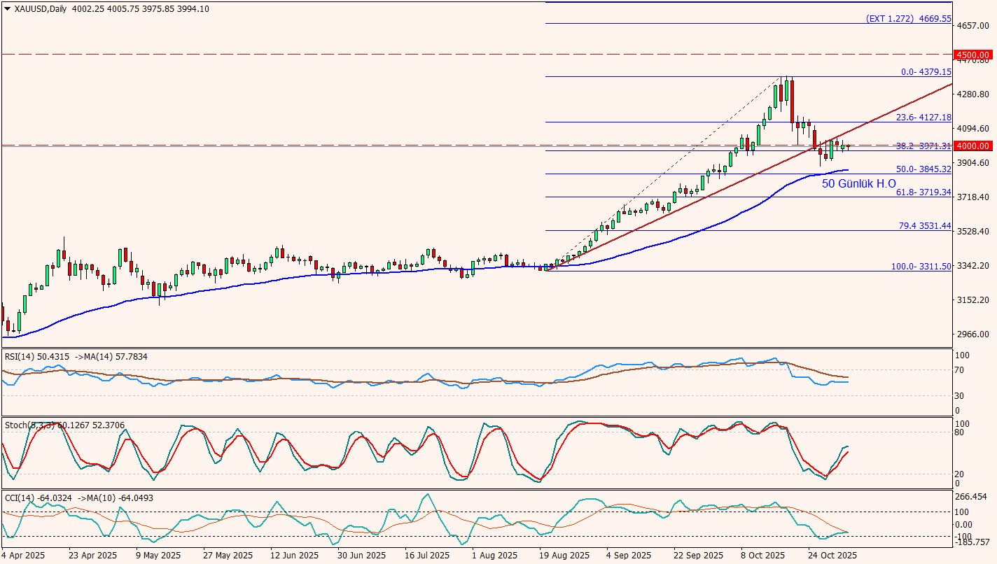Teknik göstergelere baktığımızda ise; Altın tam 4000 dolar sınırında tutunmaya çalışıyor. Bu seviye fiyatın yönü konusunda oldukça kritik bir konumda olmaya devam ediyor. Eğer güçlü bir aşağı salınımda satış baskısı güç kazanabilir. O yüzden bu seviye dikkatle takip edilip temkinli olmakta yarar var. Göstergeler tarafında da Stokastik yukarı yönlü bir eğilim içerinde bulunuyor. CCI da grafikte hafif bir yükselişe geçmiş durumda ancak bunlar pek güvenilir yönelimler olarak görünmüyor.