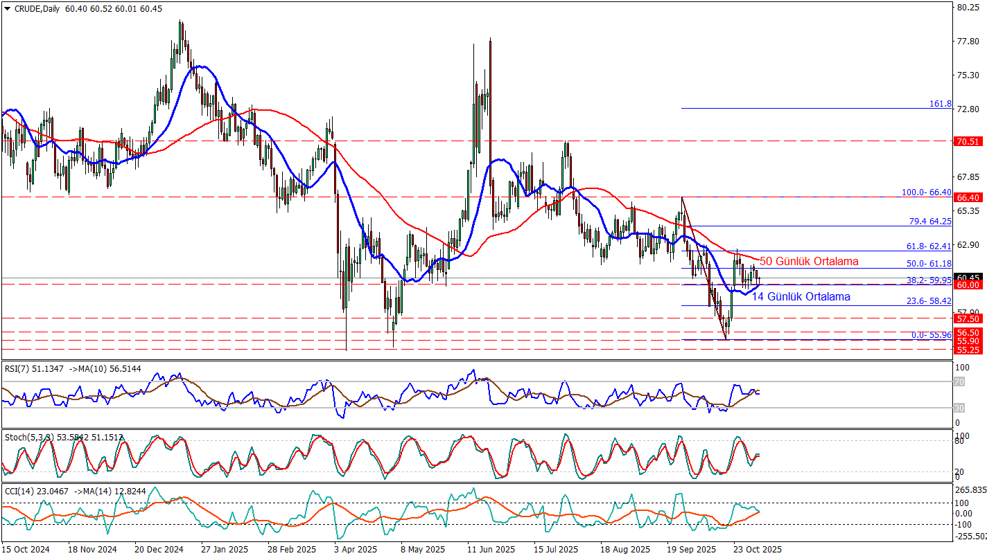Göstergeler tarafında ise; fiyat 14 günlük ortalamanın hemen üzerinde seyretmeye devam ediyor ve önündeki ilk direnç olarak 61.20 seviyesi olarak öne çıkıyor. Stokastik ve RSI nötr bölgede bulunuyor. Bugün açıklanacak olan Enerji Bilgisi İdaresi (EIA) Haftalık Ham Petrol Stokları sonuçlarına göre fiyat yönünü bulabilir o yüzden bu veride dikkatle takip edilecek.