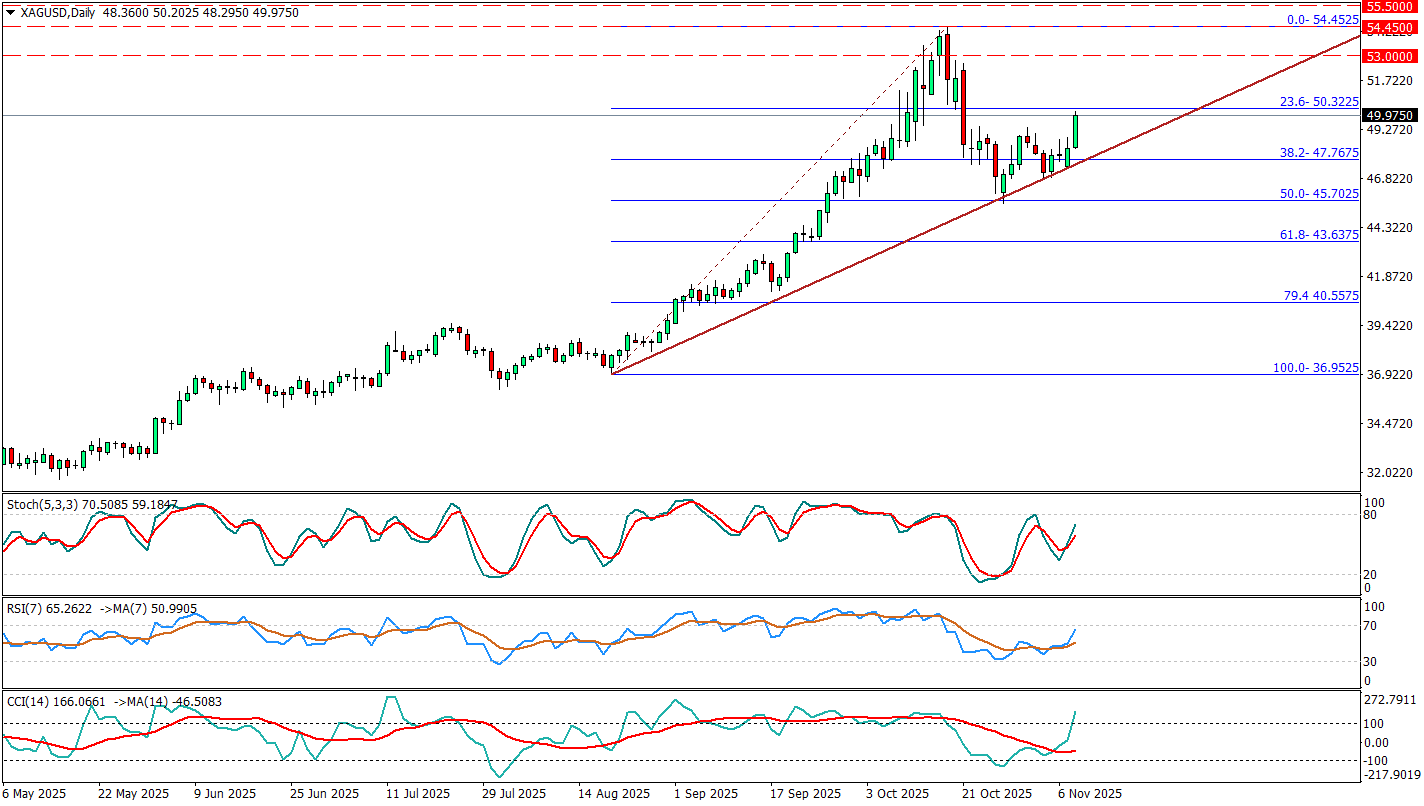 Gümüş fiyatında son günlerdeki hareketleri, bir yandan ABD Senatosu’nun hükümetin yeniden açılmasına yönelik tasarıyı ilerletmesi ve Çin’in galliyum, germanyum ve antimon gibi bazı “çift kullanımlı” ürünlerde ABD’ye ihracat kısıtlamalarını geçici olarak kaldırmasıyla risk iştahının toparlanması ve güvenli liman talebinin zayıflaması, diğer yandan ise zayıf ABD Doları’nın dolar bazlı emtiaları yabancı alıcılar için daha cazip hale getirerek gri metale %1,5’i aşan destek vermesi belirliyor; ancak hükümet kapanmasının tamamen sona ermesiyle doların yeniden güç kazanma ihtimali, XAGUSD tarafında yukarı yönlü alanı sınırlayan temel makro risk olarak öne çıkıyor. Şuan 50.30 direncini test etmeye yaklaşan gümüş burayı kırabilirse haftanın devamında yeniden 53 seviyesi hedeflenebilir. Aşağı yöne baktığımızda trend çizgisinin üstünde olması güzel. 47.75 desteği de ilk geri çekilişte önemli bir destek seviyesi olarak izleniyor.