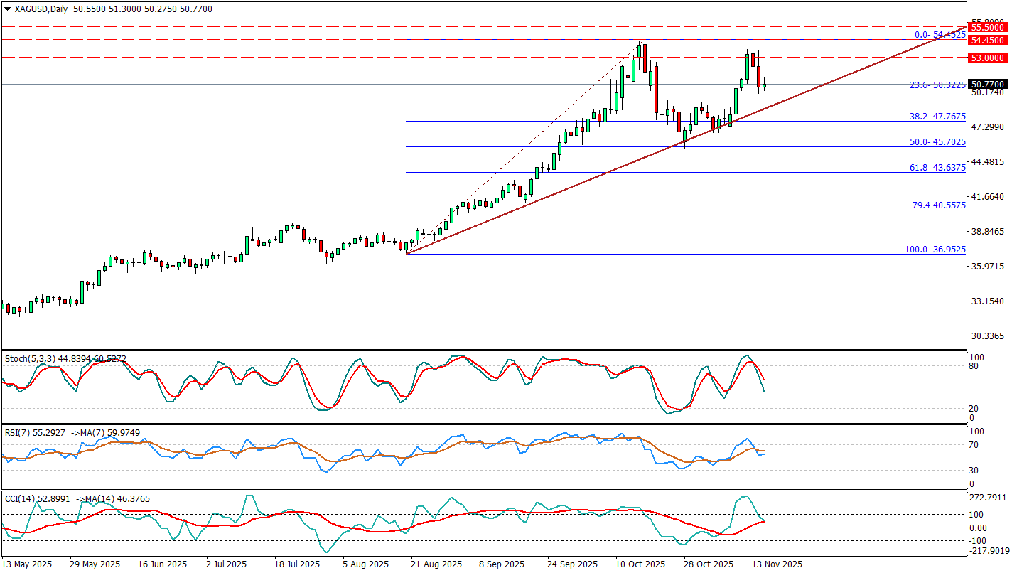 Grafikte XAGUSD’nin Ağustos’tan beri süren güçlü yükseliş trendi içinde Kasım başında 54–55 bandına kadar tırmandıktan sonra, son günlerde 23,6% Fibo ve yükselen trend çizgisinin geçtiği 50–51 bölgesinde tutunarak kısa vadeli bir düzeltmeye girdiği görülüyor; Stokastik ve RSI’daki geri çekilme de aşırı alım bölgesinden dönen ama ana trendi koruyan bir görünüm işaret ediyor. Temel tarafta bu hareket, önce ABD hükümetinin kapanmasının sona ermesiyle veri akışının yeniden başlayacağı ve Aralık’ta 25 bp’lik faiz indirimi ihtimalinin %60’ın üzerine çıktığı beklentilerinin altınla birlikte gümüşü de üç haftanın zirvesine taşıyan ralliyi tetiklemesine, ardından son günlerde Fed yetkililerinden gelen şahin mesajların faiz indirimi ihtimalini zayıflatması ve ABD tahvil faizlerini yukarı çekmesiyle 53–55 bandından sert kâr realizasyonlarının gelmesine dayanıyor. Orta–uzun vadede ise Silver Institute’ün 2025 için üst üste beşinci yapısal arz açığına işaret eden raporu gümüş fiyatlarını desteklemeyi sürdürürken, Çin ekonomisinde hız kesen büyüme ve sanayi metalleri üzerindeki baskı endüstriyel talep kanalından gelen desteği sınırlıyor; bu nedenle fiyat “arz açığı” hikâyesinden güç alarak yükselen trend çizgisinin üzerinde kalıyor. Şuanda 23.6 Fibo seviyesinden toparlanmaya çalışan gümüş tekrar 53 seviyesini hedefleyebilir. Aksi durumda ise 47.75 desteğine kadar bir geri çekilme ihtimali önemli bir ihtimal olarak ortada duruyor.