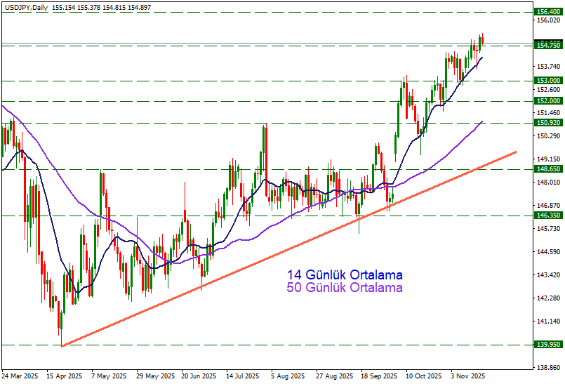 USDJPY paritesi geçtiğimiz gün 154.75 direncini aşma denemelerinde başarılı oldu. Günlük kapanış 155.16 seviyesinde gerçekleşti. Yeni işlem gününe başlarken önce yükselişler 155.37 seviyesine kadar etkili olurken son 9 ayın en yüksek seviyesi test edilmiş oldu. Ardından yen lehine tepkiler gündeme gelmeye başladı. Yen lehine tepkiler şuan cılız kalmaya devam ederken bir süredir direnç olarak takip edilen 154.75 bölgesi bu kez destek olarak test ediliyor. Fiyatlamalar bu bölge üzerinde kalmaya devam ettiği sürede yen aleyhine riskler etkin kalabilir. Öte yandan Japonya Merkez Bankası Başkanı Ueda ve Japonya Başbakanı Takaichi’nin bugün ilk kez yapacağı resmi ikili görüşmeden gelebilecek önemli açıklamalar USDJPY paritesinde oynaklıkları gündeme getirebilir.