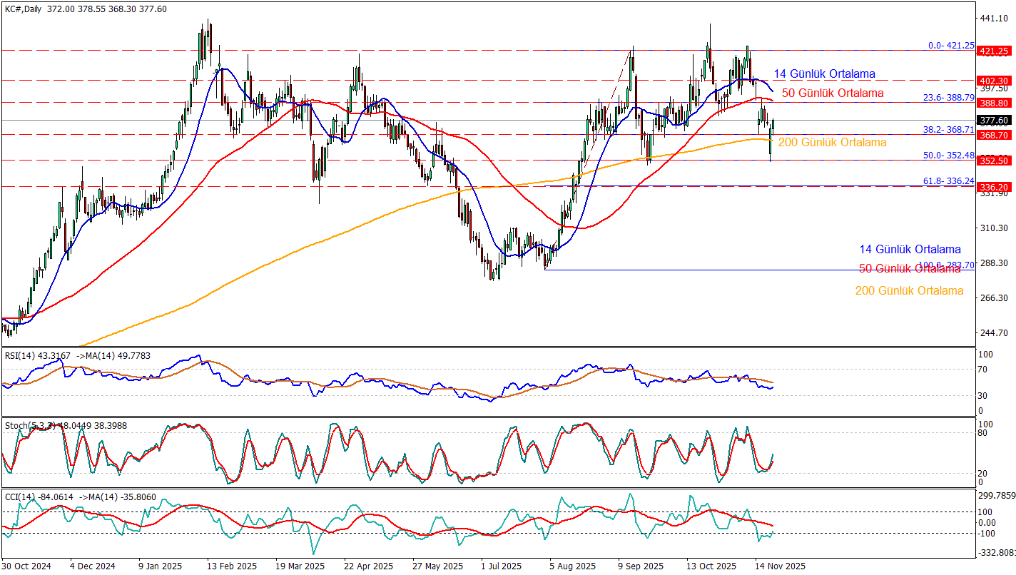 Kahve grafiğinde daha önce 50 günlük ortalamanın 200 günlüğü yukarı kesmesiyle oluşan golden cross, trendi güçlendirip fiyatı 421 bölgesine taşıyan ana teknik tetikleyiciydi; fakat son haftada ABD’nin Brezilya kahvesine uyguladığı %40 ek tarifeyi kaldırması, ABD pazarına Brezilya arzının tekrar daha düşük maliyetle akabileceği beklentisini doğurarak risk primini düşürdü ve yükselişin üzerine bir makro baskı koydu. Buna ek olarak Climatempo’nun kahve bölgelerinde yoğun yağışların sürerek yeni mahsul gelişimini destekleyeceği yönündeki tahminleri arz görünümünü daha da iyileştirince fiyatlar 400 civarına çekilip 200 günlük ortalama ve 38,2–50 fibo bandına geri döndü. RSI 43, CCI negatif zayıflama düzeltmenin sürdüğünü söylerken, fiyatın 200 günlük ortalama çevresinde tutunma çabası bu geri çekilmeyi şimdilik ana yükseliş trendi içinde bir “soğuma” olarak tutuyor; buna karşın bu bölgenin altındaki kalıcılık, düzeltmeyi 352–336 bandına doğru derinleştirebilecek teknik bir kırılma riskini artırır.