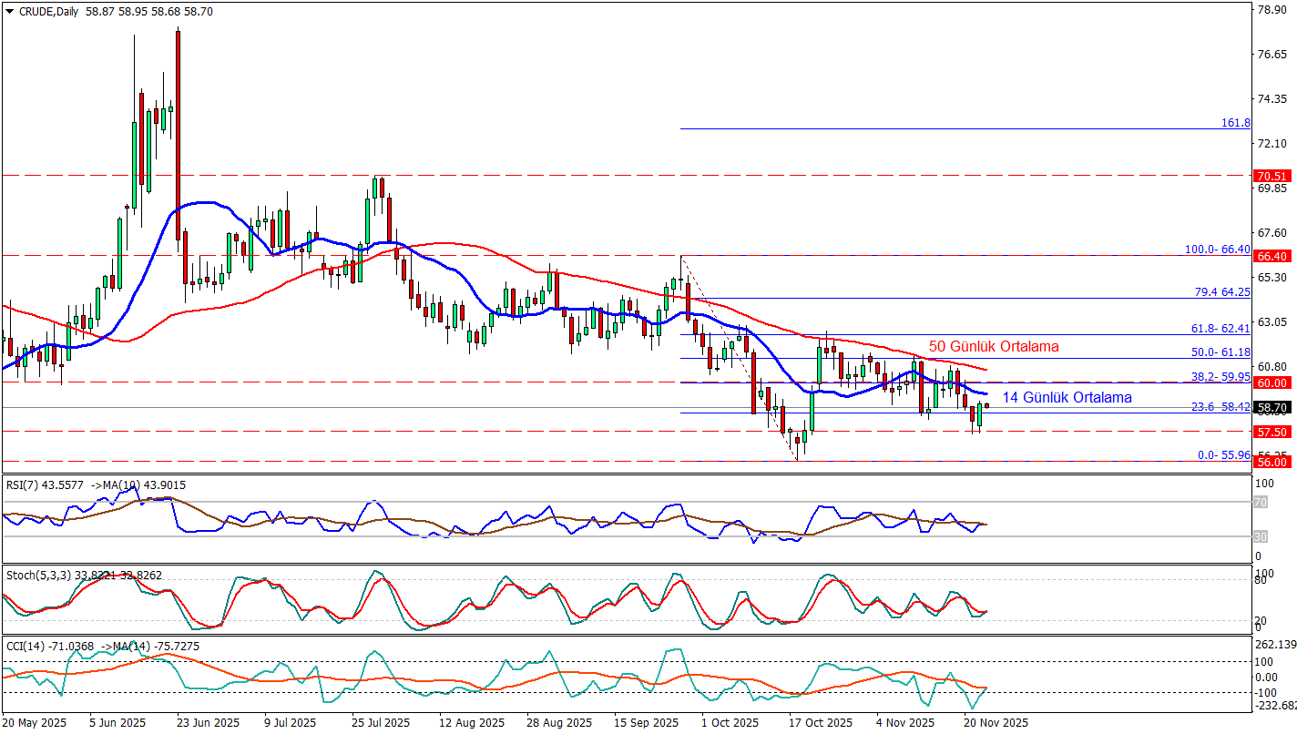 Crude, risk iştahındaki toparlanma ve FED’in Aralık’ta faiz indirimi beklentilerinin güçlenmesiyle hisse piyasalarına paralel şekilde dört seans sonra yeniden yukarı dönerek WTI tarafında 58,84 civarında kapanış yaptı; ancak ABD’nin Rusya-Ukrayna barış planında ilerleme kaydedildiğine ve olası anlaşmanın Rus petrolüne yönelik yaptırımları gevşetip 2026’ya giderken beklenen arz fazlasını büyütebileceğine dair haber akışı savaş kaynaklı risk primini düşük tutarak yükselişleri sınırlayan ana makro unsur olmaya devam ediyor. Teknik tarafta fiyat hâlâ düşüş sonrası toparlanma denemesi içinde: 57.50 seviyesinden gelen tepkiyle 23,6 fibo eşiği olan 58,42’nin üzerine tutunma çabası görülürken, kısa vadeli görünümün net şekilde iyileşmesi için 60,00 bandının ve hemen üzerinde seyreden 50 günlük ortalamaların yeniden aşılması gerekiyor. RSI’ın 40’lar civarında kalması ve stokastik göstergedeki toparlanma isteği, momentumun zayıf ama yukarı yönlü denemelere açık olduğunu, buna karşın ortalamalar altında kalındıkça tepkinin “düzeltme” niteliğinde kalabileceğini işaret ediyor.