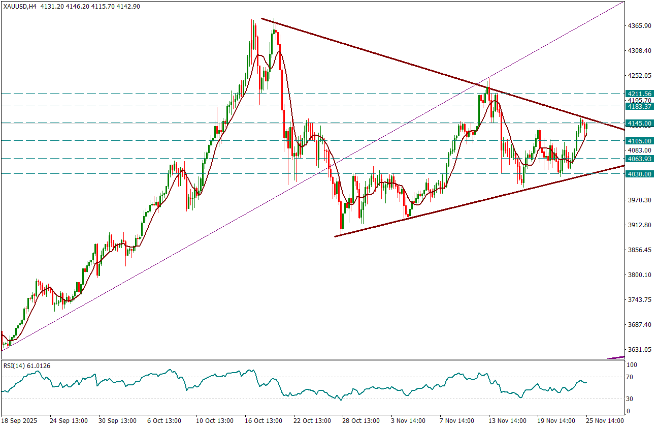 Ons Altın sıkıştığı üçgen içerisinde üçgenin üst bandını yeniden test ediyor. 4145 direnci bu aşamada önemli. Bu bölgeyi birkaç dört saatlik mum kapanışıyla kırması halinde pozitif hareketler güçlenebilir.