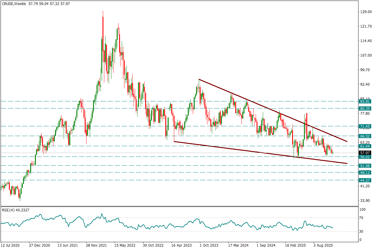 Ham petrol fiyatları baskılanmaya devam ediyor. Haftalık grafikte de 61.45 direnci altında baskı yediğini görmekteyiz. Daha uzaktan baktığımızda ise alçalan takoz içerisinde kalmayı sürdürüyor Alçalan takozun yukarı yönde kırılıp sert yükseliş yapılabilmesi için kademeli olarak 61.45 ve 66.50 dirençlerini kırmasını izlememiz gerekir. Aksi durumda bu dirençlerin her denemesi kar satışı potansiyelini gösterebilir.