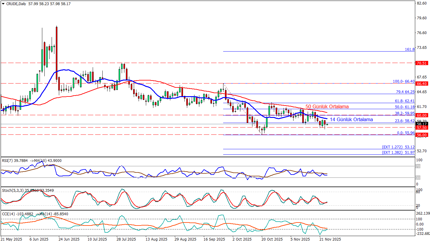 Grafikte Crude’nin orta vadede 50 günlük (60,00) ve 14 günlük (59,00) ortalamaların altında kalarak düşüş trendini sürdürdüğü görülüyor. Ekim ayında 55,90–56,00 bölgesinden başlayan tepki, Fibonacci 61,8 düzeltmesine denk gelen 62,80 civarında sınırlı kalmış ve sonrasında yeniden aşağı yönlü baskı artmış durumda. Fiyat şu an 23,6 Fibonacci düzeltmesi (58,40) ile 57,50 yatay desteği arasında dalgalanırken, RSI’ın 40 civarındaki zayıf görünümü ve Stokastik’in orta banttan aşağı kıvrılması, satıcıların henüz tamamen geri çekilmediğine işaret ediyor. 57,50–56,00 bandı korunduğu sürece 58,40 ve 60,00–61,00 (38,2–50 fibo + hareketli ortalamalar kümesi) bölgesine doğru tepki alımları mümkün olsa da, 56,00 altında günlük kapanış yeni bir düşüş bacağını tetikleyerek 53,00–52,00 bandını gündeme getirebilir.