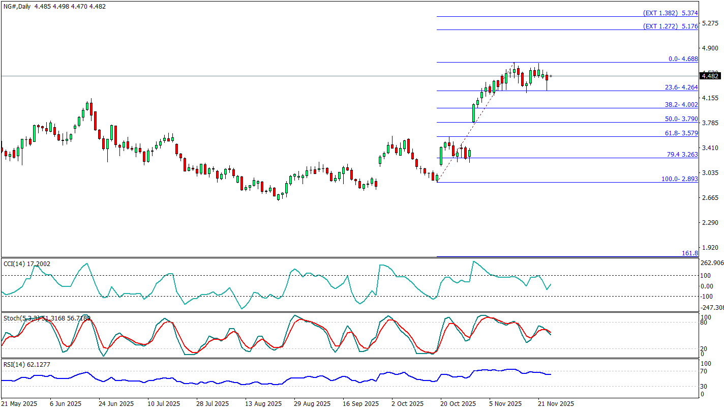 Doğalgazda ekim ortasından bu yana 2,89’dan başlayan güçlü ralli 4,69 zirvesinde şimdilik yatay bir konsolidasyona dönmüş durumda; fiyat 4,48 civarında 0,0 Fibonacci (4,69) ile 23,6% düzeltme (4,26) arasında sıkışırken RSI’ın 60’lar üzerinde kalması ve CCI’ın pozitif bölgede tutunması, momentumun zayıflasa da hâlen bozulmadığını gösteriyor. 4,26–4,00 bandı yukarı trend için ilk kritik destek bölgesi olarak öne çıkarken, bu bölgenin üzerinde kalındığı sürece 4,69 zirvesinin yeniden test edilmesi ve kırılması hâlinde 5,17–5,37 (1,272–1,382 fibo uzatma) hedeflerinin gündemde kalması teknik olarak mümkün; buna karşılık 4,26 altında kapanışlar 3,79 ve altına doğru daha derin bir düzeltmeyi tetikleyebilir. Makro tarafta ise, EIA’nın 2025 için üretim tahminini rekor seviyelere yukarı revize etmesi ve günlük üretimin tarihi zirvelere yakın seyretmesi, bu yükselişin üzerinde “arz bolluğu” kaynaklı önemli bir tavan baskısı oluşturuyor.