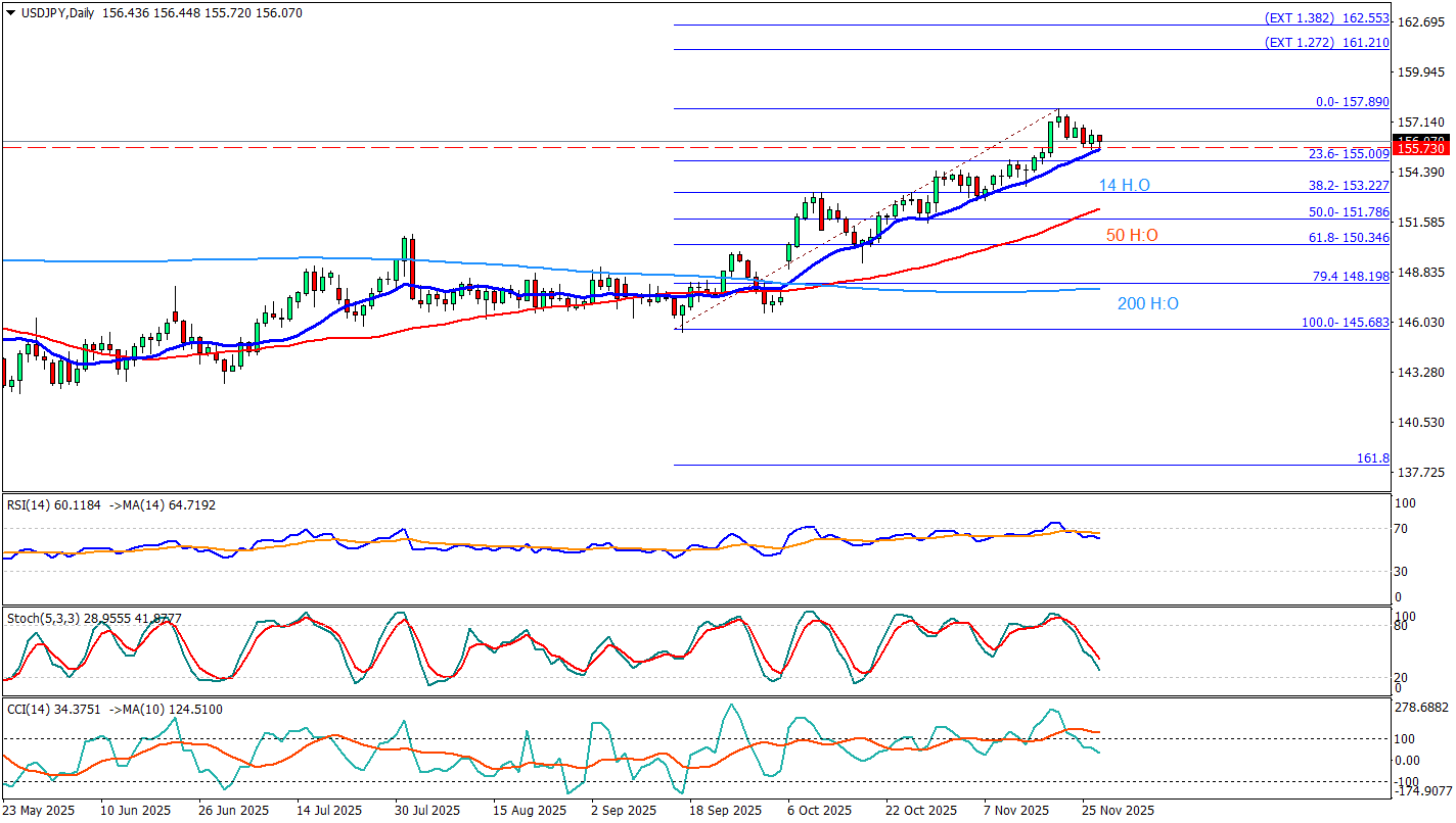 USDJPY günlük grafikte Fiyat hâlen kısa vadeli yükseliş kanalını temsil eden 14 günlük hareketli ortalamanın (mavi) hemen üzerinde 156,00 civarında tutunurken, bu ortalama ile 23,6% Fibonacci düzeltme seviyesi olan 155,00 bandı ilk önemli destek bölgesi konumunda; bu bölge üzerinde kalındığı sürece 157,90 zirvesine ve olası yeni tarihi tepe denemelerine doğru yükseliş eğiliminin korunması beklenebilir. RSI 60 seviyesinde hâlâ pozitif bölgede olsa da tepe seviyelerinden hafif geri çekilerek momentumda bir yavaşlamaya işaret ederken, Stokastik göstergenin 80 üstü aşırı alım bölgesinden aşağı yönelmesi kısa vadede ara düzeltme riskinin sürdüğünü gösteriyor. 155,00 altında ise 153,20 (38,2% fibo) ve 151,80 (50% fibo – 50 günlük H.O’ya yakın bölge) kademeleri daha derin bir düzeltmede izlenecek diğer destekler olarak öne çıkıyor.