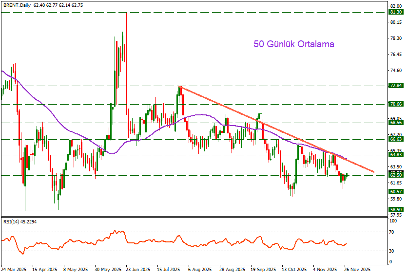 Brent petrol geçtiğimiz gün başlayan pozitif hareketlerle 62.50 direncindeki günlük kapanışın ardından yeni işlem gününde bu direnci hafif şekilde aşarak 62.75 seviyesinde işlem görüyor. Günlük kapanışın bu direnç üzerinde gerçekleşmesi durumunda 72.84 bölgesinden gelen düşüş trend çizgisi direnç olarak test edilebilir.