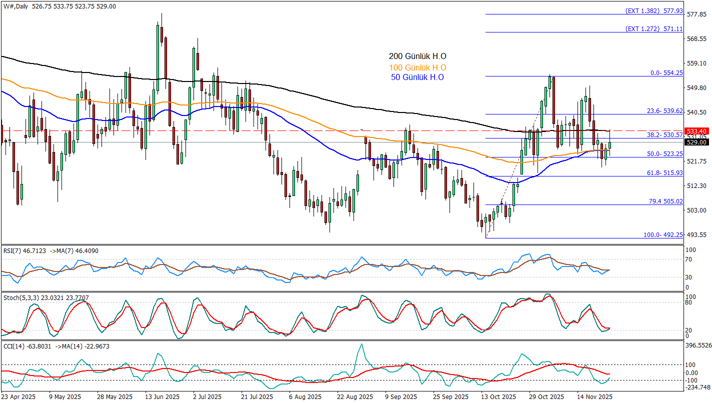 Buğday, günlük grafikte Ekim sonundaki 492 bölgesinden başlattığı yükselişin ardından 554,25 seviyesindeki tepeyi gördükten sonra düzeltme sürecine girerek şu an 529 civarında, 38,2% Fibonacci (530,5), 50% Fibonacci (523,3) ve 50–100 günlük hareketli ortalamaların oluşturduğu sıkışık bölgede dalgalanıyor. 200 günlük ortalama ve 38,2% Fibo’nun çakıştığı 530–533 bandı ilk önemli direnç olarak fiyatı yukarıda baskılarken, RSI’ın 50’nin hemen altında yatay seyretmesi, Stokastik’in dipten yukarı dönmeye çalışması ve CCI’ında -100 sınırından yukarı dönmesi , piyasanın hafif bir toparlanma sürecine girdiğini gösteriyor. Bu görünümde 523–516 bandı (50% ve 61,8% Fibo ile kısa vadeli ortalamalar) ilk kritik destek alanı olarak öne çıkarken, bu bölge üzerinde kalıcılık sağlanması durumunda 539 ve 554 seviyelerine doğru toparlanma denemeleri gündeme gelebilir.