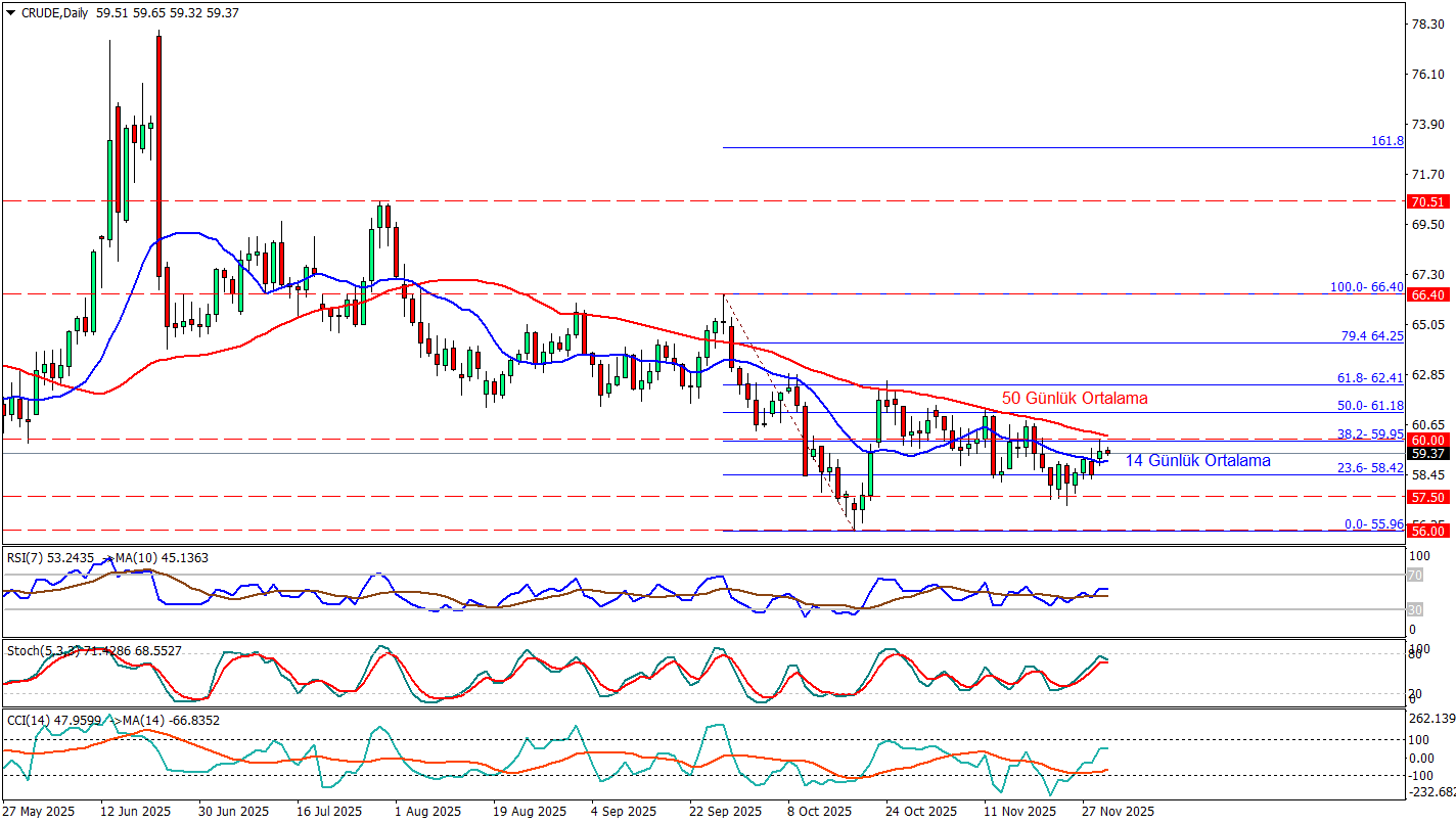 CRUDE günlük grafikte 59.50 civarına toparlanmış durumda; fiyat şu an 14 günlük ortalamanın (mavi) hafif üzerinde seyrederken, düşen 50 günlük ortalama ile 60.00 bandındaki %38,2 Fibonacci düzeltmesinin hemen altında sıkışıyor ve bu bölgeyi kısa vadeli ana direnç hâline getiriyor. RSI 50 eşiğinin ve kendi hareketli ortalamasının üzerine çıkarak momentumdaki toparlanmaya işaret ederken, Stokastik osilatör 68 civarındaki yukarı eğilimiyle tepkinin bir miktar daha sürebileceğini gösteriyor fakat aşırı alım bölgesine de yaklaşmış durumda. CCI de eksi bölgelerden sıfırın üzerine toparlanarak alım iştahını destekliyor; ancak fiyat 60.00 üzerinde kalıcı olamazsa bu göstergelerdeki iyileşme sınırlı kalabilir ve yeniden 58.40 (23,6 Fibo) ile 57.50/56.00 destek bölgesine doğru geri çekilme riski masada kalmaya devam eder.