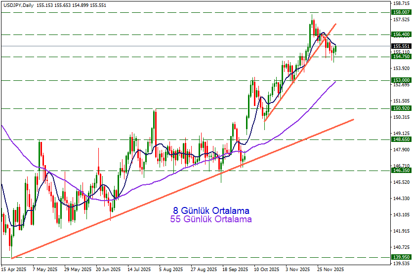 USDJPY paritesi geçtiğimiz haftanın son işlem gününde 154.75 desteğinden gelen yukarı yönlü tepkilerle haftayı 155.35 seviyesinde kapatmıştı. Yeni haftanın ilk gününde yukarı yönlü hareketler etkili olmaya devam ederken 155.55 bölgesinde 8 günlük hareketli ortalama direnç olarak test ediliyor.
