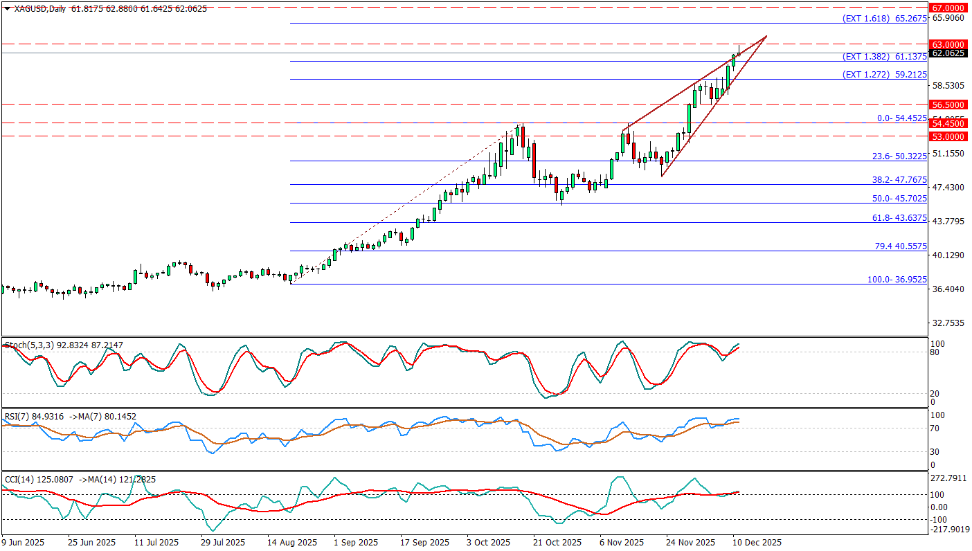 XAGUSD günlük grafikte, son rallisiyle birlikte yükselen takozun üst bandına ve 63,00 direncine dayanmış durumda; fiyat şu an 1,382 Fibonacci uzatma seviyesi olan 61,15 bandı ile 63,00 psikolojik eşiği arasında sıkışıyor. Stokastik 90 üzeri aşırı alım bölgesinde yataylaşıyor, RSI 80’in üzerinde, CCI ise +120 civarında seyrederek güçlü ama “gecikmiş” bir düzeltme riskine işaret ediyor; kısa vadede göstergelerde oluşabilecek aşağı yönlü kesişmeler kâr realizasyonu/satış baskısı sinyali olarak okunabilir. Bu tabloda 61,15 ilk ara destek, takoz alt bandı ile birlikte 59,20 ve altında 56,50 – 54,45 bölgesi daha kritik geri çekilme alanları; buna karşılık 63,00 üzerinde kalıcı bir kırılma, 65,25 (1,618 uzatma) bölgesine doğru ralliyi uzatabilir. FED’in faiz indirimine gitmesi kısmi bir destek sağlamış görünüyor ama net bir hareket yaratmadı bunun sebebi ise FED’in önümüzdeki süreçte temkinli davranacağının sinyallerini vermesi ile birlikte faiz indirimlerinin devam etmeyebileceği ihtimalinin gündeme gelmesi olduğunu söyleyebiliriz.