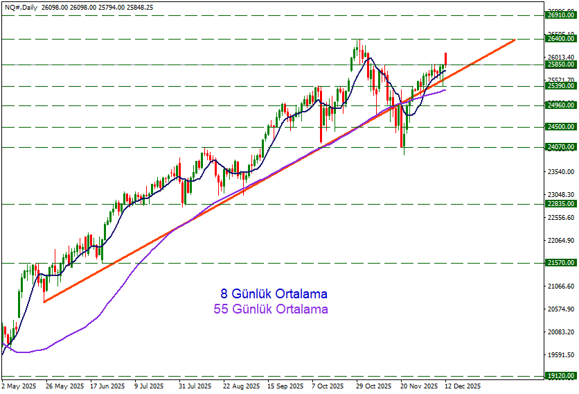 Son günlerde yükseliş trend çizgisini yakın şekilde takip eden vadeli Nasdaq endeksi, geçtiğimiz günü 25834 seviyesinde kapatmasının ardından yeni işlem gününe 26098 seviyesinde yukarı yönlü gap ile giriş yaptı. Ancak gapli açılış sonrasında gün boyunca aşağı yönlü tepkiler alan vadeli Nasdaq 25794 seviyesine kadar düşüşler gördü.