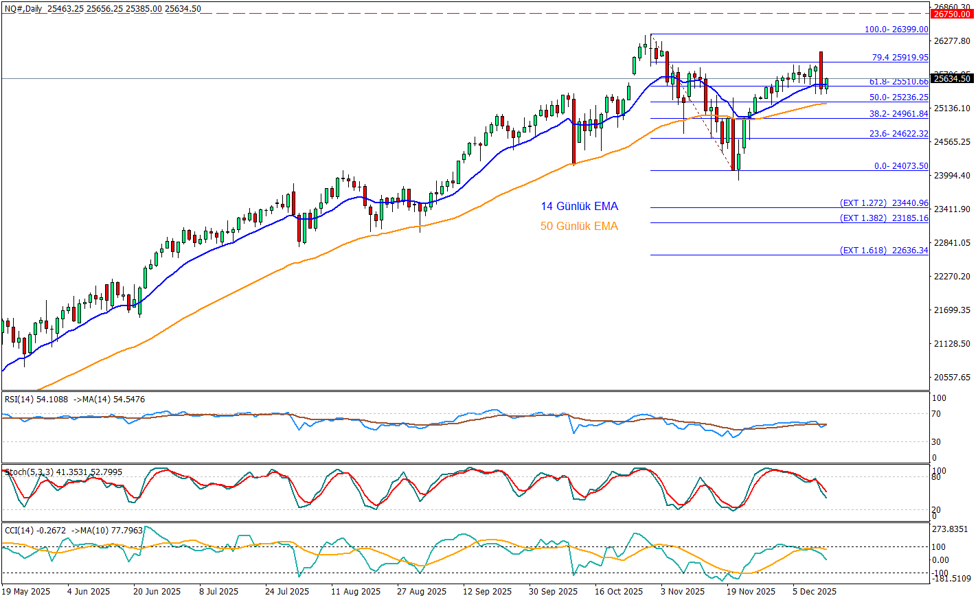 Nasdaq CFD grafikte son günlerdeki yükseliş ivmesi korunurken fiyatın 50 günlük EMA üzerinde tutunması pozitif resmin bozulmadığını gösteriyor ancak son yükseliş denemesinde 26100 bandından gelen satışla birlikte kısa vadeli momentumun zayıfladığı görülüyor. Bu nedenle teknik olarak 25510 (61,8 Fib) üzerindeki kalıcılık korunursa yeniden 25920 ve devamında 26399/26750 dirençlerine doğru ataklar gündeme gelebilir; buna karşın 25510 altı kapanışlarda geri çekilmenin 25236 ve 24962 desteklerine doğru derinleşme riski artar. Önceki sert düşüş tarafında ise fiyatlamayı bozan ana katalizör, teknoloji hisselerinde risk iştahını aşağı çeken satış dalgasıydı; özellikle Oracle ve Broadcom gibi ağır toplarda görülen değer kaybı endekste geri çekilmeyi hızlandırmıştı.