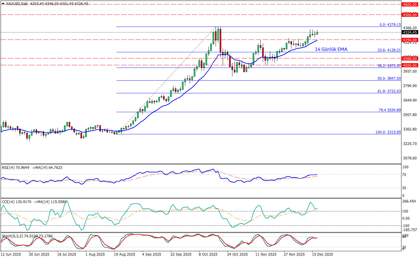 Ons altın günlük grafikte ana resim yukarı trendi gösteriyor. Fiyat 14 günlük EMA’nın üzerinde kalmaya devam ederek dipleri yukarı taşıyor ve yeniden 4.340–4.380 bandındaki ana direnç bölgesini (0.0 ≈ 4379) zorlamaya yaklaşıyor. Momentum tarafında göstergeler güçlü ama aşırı bölgede olmaları tedirgin ediyor. RSI 72 ile aşırı alım bölgesine geçmiş, CCI 137 (+100 üstü) alım baskısının hâlâ canlı olduğunu gösteriyor ama yatıklaşmış bir görüntüde olması soru işaretlerini arttırıyor, Stokastik 78 ise yukarı trend içinde kısa vadeli doyuma yaklaşıldığını işaret ediyor. Bu kombinasyon genelde iki şeye işaret eder: trend pozitif kaldığı sürece geri çekilmeler düzeltme / alım fırsatı gibi çalışabilir; fakat kısa vadede kâr realizasyonu gelirse ilk izlenecek destekler 4250-4128 bandı ve devamında 4000-4066 bölgesi olur. Yukarıda ise 4.380 kırılırsa psikolojik 4.500 hedefi tekrar konuşulabilir. Eğer kırılım gelmezse 4.250 üstünde tutunma trendin sağlığı açısından kritik kalır.