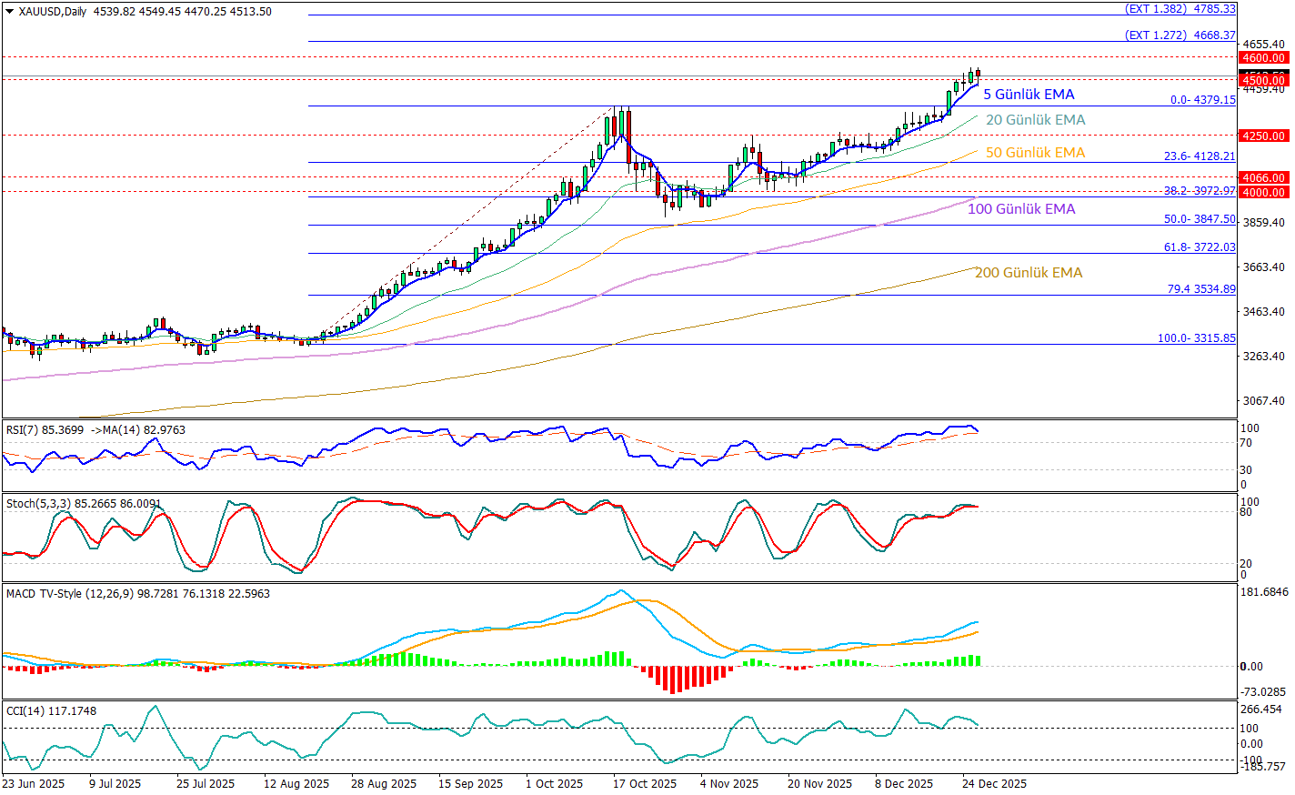 Ons Altın yeni haftaya 4500 üzerinde başlayarak yükseliş trendini sürdürmeye çalışıyor. Fiyatın 5 günlük EMA’nın üzerinde kalması ve 5–20–50 günlük ortalamaların yukarı yönlü sıralanması, kısa/orta vadede alıcıların kontrolünü sürdürdüğünü gösteriyor. Buna karşın 4500–4600 bandı hâlen güçlü bir direnç bölgesi eğer 4500 desteğinin üzerinde tutunma kalıcı olursa 4600’e doğru yol alınabilir.