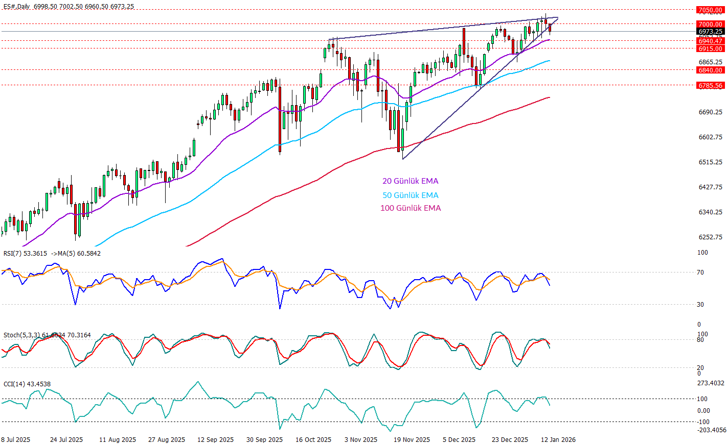 SP 500 vadeli günlük grafikte ana resim yukarı trend, çünkü fiyat 20 ve 50 günlük EMA’ların üzerinde kalmayı başarıyor ve dipler yükseliyor ancak kısa vadede fiyat 7000 psikolojik direnç çevresinde “sıkışma” yaşıyor. Üçgen yapıda, yükselen destek çizgisi ile hafif yatay yükselen üst bant arasında daralan bir kama/üçgen oluşmuş; bu tür yapıların “karar anı” genelde kırılımdan sonra kırılım yönünde sert hareket şeklinde gerçekleşir ve fiyat aşağı yönlü bir kırılım gösterip satış baskısını arttıran bir kırmızı mum yakmış durumda. Bu satış baskısı 20 günlük Emaya kadaar devam edebilir. 20 günlük EMA kritik bir karar noktası olarak izlenecek. Eğer buradan alış tepkisi alabilirse trend yönüne doğru dönebilir ama almaz ise 6915 seviyesine doğru geri çekilme derinleşebilir.